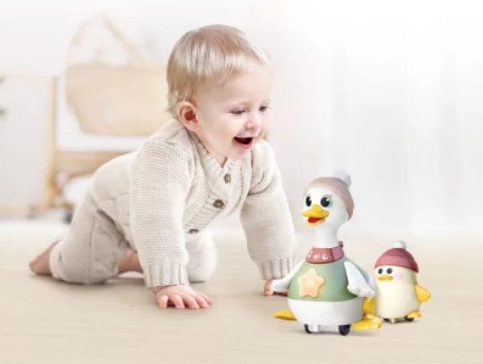 این مجموعه شامل یک اردک مادر و یک اردک بچه است که با حرکتهای بامزه و ملایم توجه کودک را به خود جلب میکنند و باعث میشوند کودک بخواهد آنها را دنبال کند و بازی کند.
