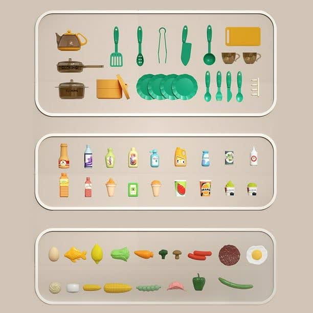 این ست شامل ۹۳ قطعه مجزا است. از قابلمه و تابه گرفته تا انواع سبزیجات، میوهها، بطریهای سس، تخته خردکن و حتی دسرهای کوچک. وجود یخچال، فر بازشو و قفسههای متعدد در بدنه اصلی آشپزخانه، به کودک آموزش میدهد که چگونه پس از بازی، وسایل خود را نظمدهی و مرتب کند.
