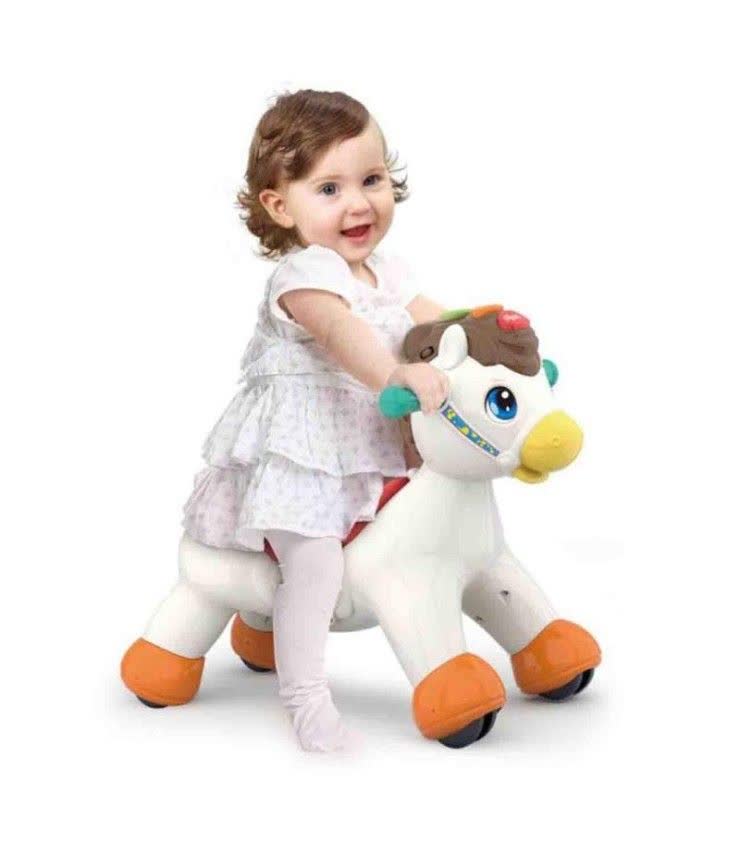 - حالت واکر و سواری (Riding Pony): با جدا کردن صفحه سبز زیرین، اسب پونی تبدیل به یک چهارچرخ روان میشود. کودک با پا زدن، مهارتهای حرکتی و قدرت عضلانی پاهای خود را تقویت میکند.