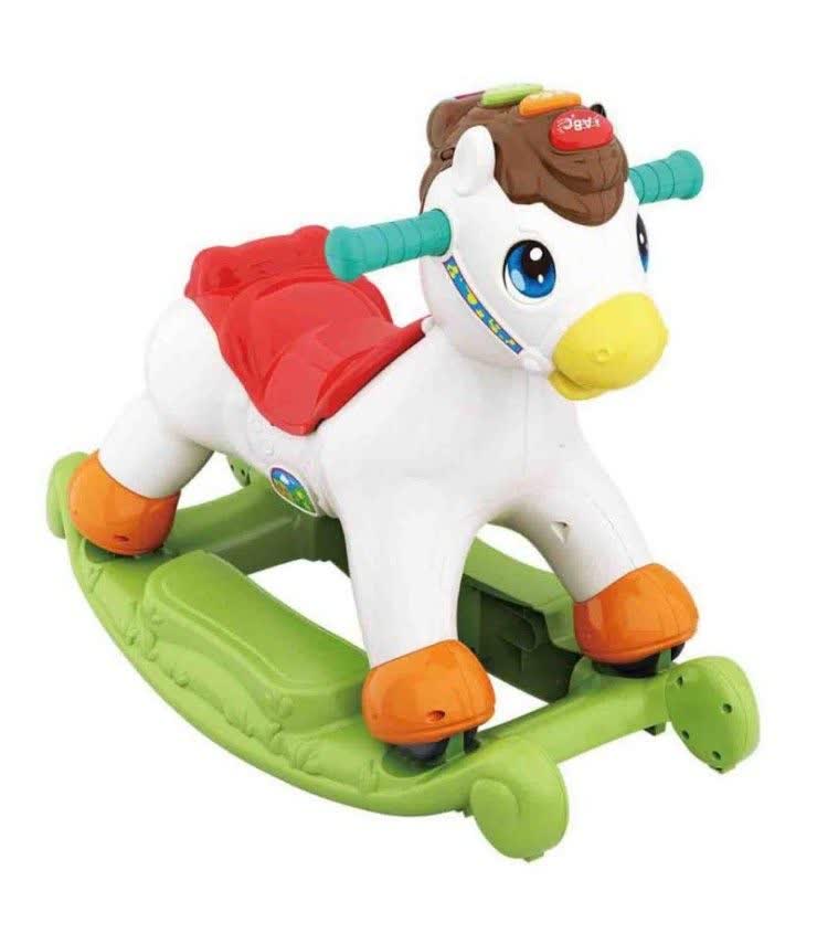- پنل آموزشی موزیکال (Learning Center): روی یال اسب، دکمههای رنگی و چراغداری تعبیه شده که با فشردن آنها، موزیکهای شاد و آموزش حروف الفبا پخش میشود که هوش شنیداری کودک را ارتقا میدهد.
