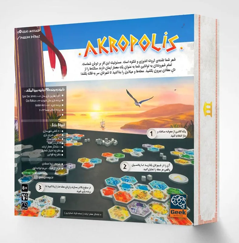 بازی فکری آکروپلیس Akropolis یک بازی خانوادگی با تم ساختوساز و استراتژی است که شما را به دنیای معماران یونان باستان میبرد. در این بازی، بازیکنان با کاشیچینی هوشمندانه، شهر خود را گسترش میدهند و با ساخت محلههایی چون بازار، باغ، معابد و پادگان، امتیاز کسب میکنند. با استفاده درست از منابع مانند سنگ و رعایت قوانین خاص در ساخت طبقات بالاتر، ارزش محلهها افزایش مییابد. آکروپلیس نامزد جایزه بهترین بازی سال شده و برای ۲ تا ۴ بازیکن ۸ سال به بالا طراحی شده است. زمان هر بازی حدود ۲۵ دقیقه است. با گروه گیک بردگیم، تجربهای جذاب از یک بازی ایرانی با ریشههای جهانی را لمس کنید.