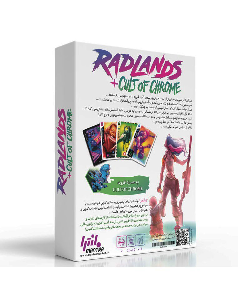 بازی ردلندز با افزونه آیین کروم (Radlands + Cult of Chrome) نسخه ایرانی یکی از تحسینشدهترین بازیهای دونفره جهان است. این بازی کارتی، یک دوئل تمامعیار در دنیایی پساآخرالزمانی را به تصویر میکشد؛ جایی که آب، باارزشترین منبع حیات محسوب میشود. هر بازیکن با مدیریت کارتها، توکنهای آب و ایجاد همافزایی میان نیروها، تلاش میکند کمپهای حریف را نابود کند. ردلندز برنده جایزه بهترین بازی دونفره سال ۲۰۲۱ بوده و با طراحی تصویری چشمگیر، عمق استراتژیک بالا و زمان بازی کوتاه، انتخابی ایدهآل برای بازیکنان حرفهای است. افزونه آیین کروم تنوع و چالشهای جدیدی به بازی اضافه میکند.