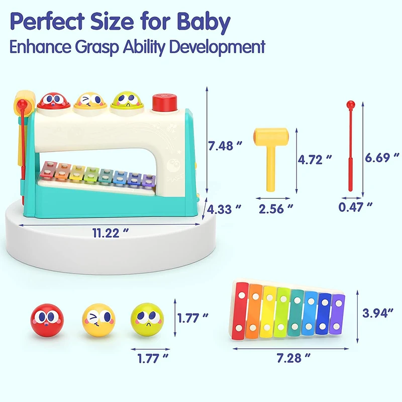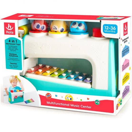 اسباب بازی بلز توپی هالی تویز Hola Toys multifunctional music center HE792700 یک سرگرمی عالی و آموزشی برای کودکان 18 ماه به بالا است. اسباب بازی چکش و بلز هولی تویز یک اسباب بازی موزیکال دو کاره است. در قسمت بالایی این اسباب بازی سه عدد توپ رنگی و یک عدد چکش وجود دارد که کودکان با کوبیدن بر روی توپها و دیدن حرکت آنها در مسیر، ضمن تقویت ماهیچههای خود لذت فراوانی میبرند. در قسمت پایین این اسباب بازی یک بلز 8 نت رنگارنگ وجود دارد که از اسباب بازی جدا می شود و می توان به تنهایی از آن استفاده کرد همچنین کودکان میتوانند با کمک مضراب همراه محصول روی تیغه ها ضربه زده و ریتم را یاد بگیرند. کودک شما با این اسباب بازی دو کاره ساعتها سرگرم بازی با اسباب بازی چکش و توپ و نواختن بلز خواهد بود.
