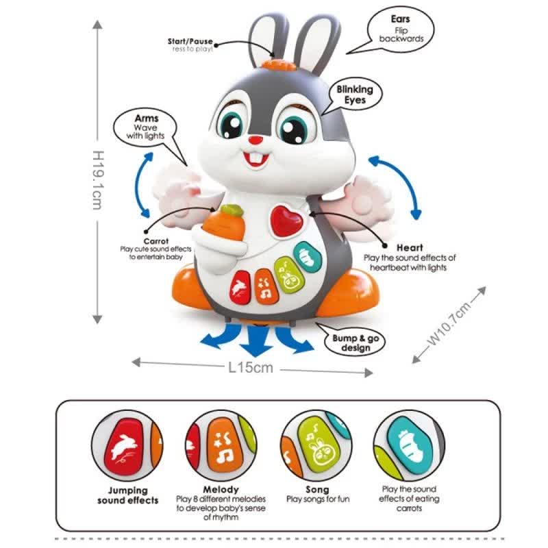 دکمههای رنگی روی بدن خرگوش ۸ ملودی مختلف به همراه آهنگ پخش میکنند که به برانگیختن حواس شنیداری کودک نیز کمک میکند. همچنین دارای افکتهای صوتی مانند صدای خوردن هویج و صدای پریدن خرگوش نیز میباشد. با فشار دادن دکمهی قلب، چراغ آن روشن و صدای تپیدن قلب پخش میگردد و با زدن بر روی هویج نیز افکتهای صوتی بامزهای برای کودک به صدا درمیآید.