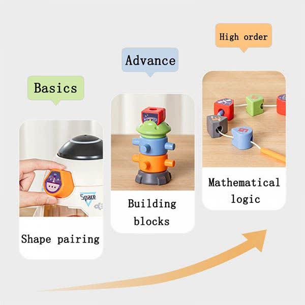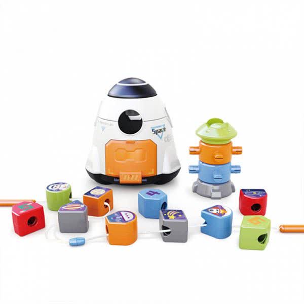 ۱. سطح پایه: کودک با استفاده از حفرههای روی بدنه سفینه، قطعات را جفت کرده و داخل آن میاندازد. این کار باعث شناخت اشکال و تقویت عضلات دست میشود.