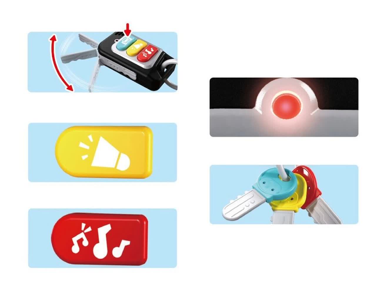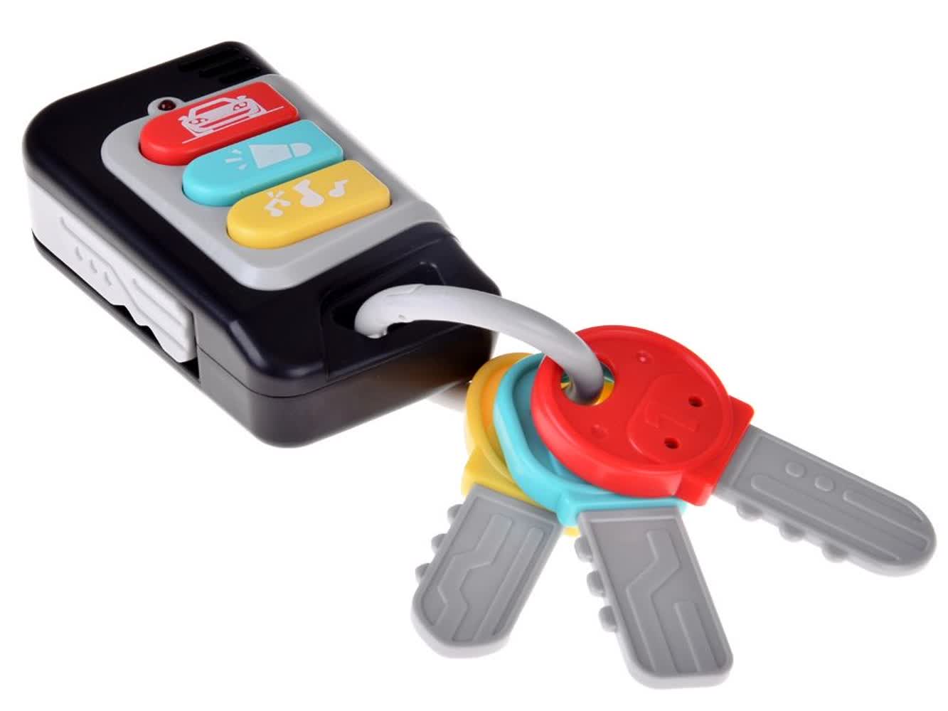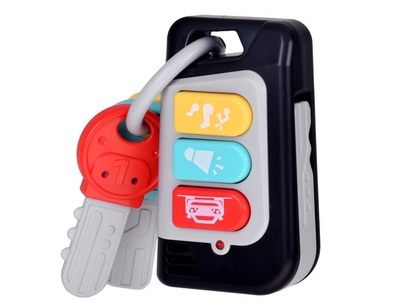 - طراحی واقعگرا و جذاب: شکل و شمایل این اسباببازی کاملاً شبیه به یک سوئیچ استارت و دستهی کلید ماشین طراحی شده است که حس غرور و استقلال را در کودک تقویت میکند و او را تشویق به بازی تقلیدی میکند.