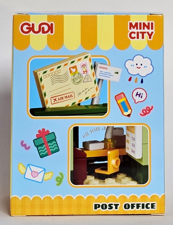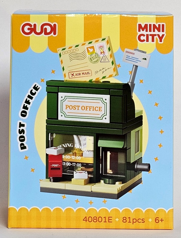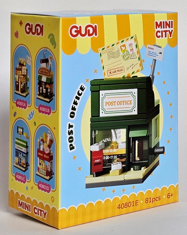 لگو اداره پست Gudi mini post office 40801E یک مجموعه فانتزی ساختنی بلوکی است که شامل 81 قطعه میباشد. این مجموعه به کاربر این امکان را میدهد تا سازهای از نوع اداره پست کوچک با نمای بخش داخلی و فضای بیرونی را با استفاده از قطعات رنگی و طراحی خیابانی بسازد.