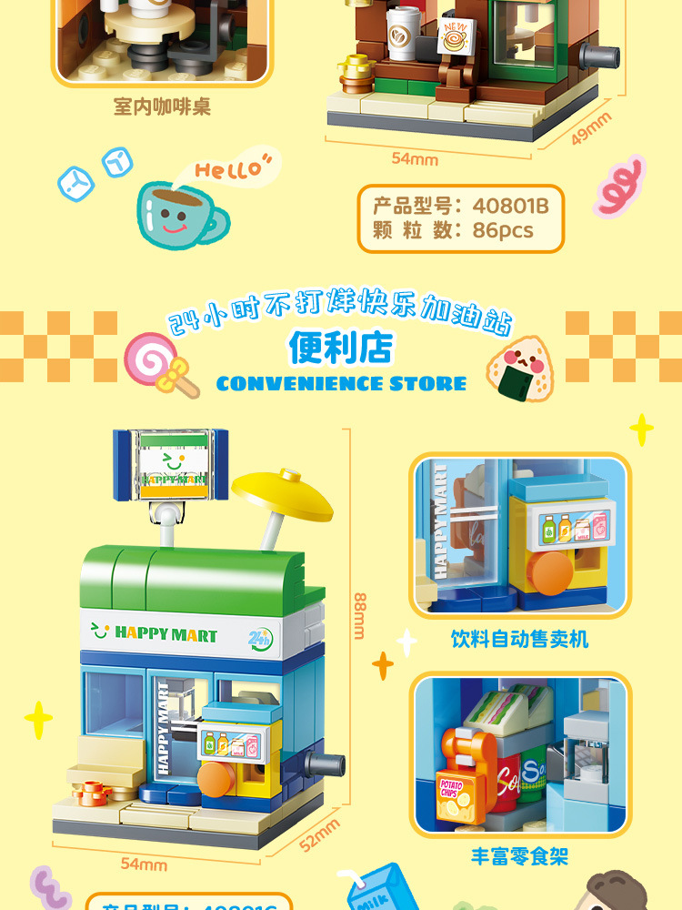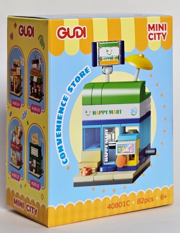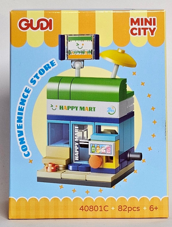 لگو سوپر مارکت Gudi mini city convenience store 40801c یک مجموعه ساختنی بلوکی با موضوع سوپرمارکت است که شامل ۸۲ قطعه میباشد. این مجموعه به کاربر این امکان را میدهد تا سازهای از نوع فروشگاه کوچک – با ویترین، بخش داخلی، و فضای بیرونی – را با استفاده از قطعات رنگی و طراحی خیابانی بسازد.