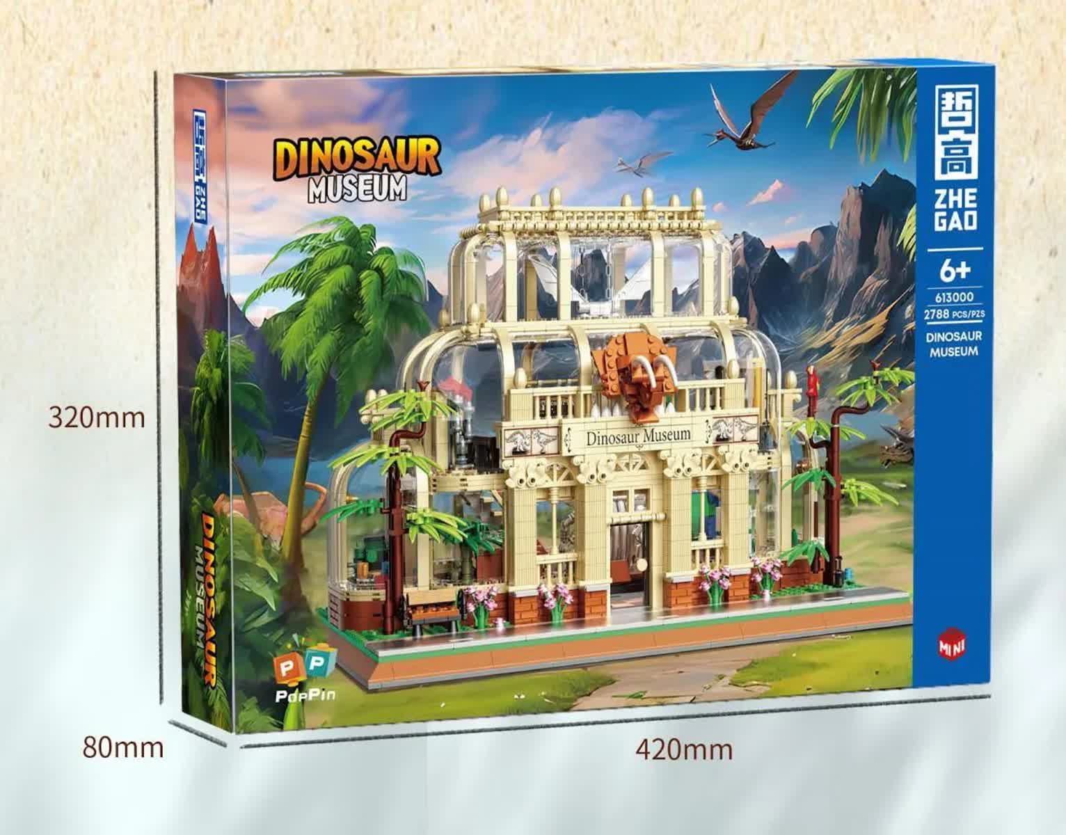 لگو موزه دایناسور Dinosaur Museum 613000 یکی از جذابترین و پرجزئیاتترین ستهای سری معماری است که توسط برند Zhe Gao طراحی شده است. این مجموعه با دارا بودن ۲۷۸۸ قطعه از نوع مینی (Mini Blocks)، تجربهای لذتبخش و چالشبرانگیز از ساخت یک بنای کلاسیک و علمی را ارائه میدهد. در طراحی این محصول، تمامی استانداردهای یک موزه واقعی رعایت شده است. ابعاد نهایی این سازه پس از ساخت، حدود ۳۴.۶ سانتیمتر طول و ۲۱.۶ سانتیمتر ارتفاع است که آن را به یک المان دکوری باشکوه تبدیل میکند. در نمای جلویی این موزه، یک تندیس بزرگ از اسکلت دایناسور خودنمایی میکند که نماد اصلی مجموعه است.