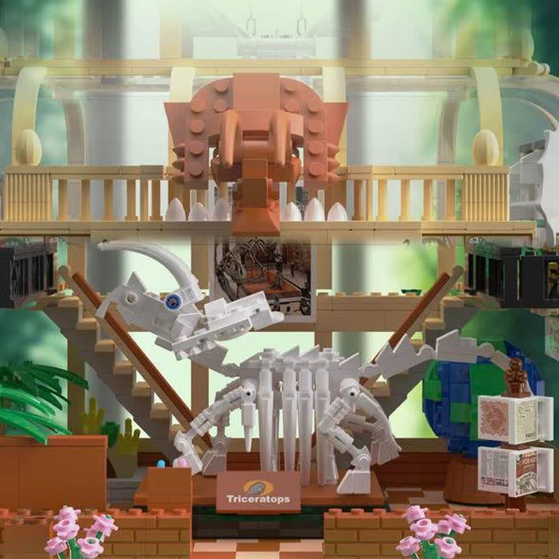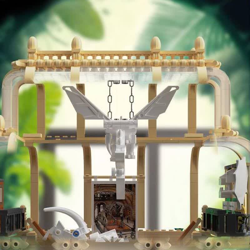 با باز کردن بخشهای جانبی یا نگاه از پنجرههای بزرگ، میتوان جزئیات داخلی Dinosaur Museum را مشاهده کرد. این موزه شامل تالارهای مختلفی برای نمایش اسکلتها، فسیلها و ابزارهای کاوش است. طبقات به گونهای طراحی شدهاند که فضای کافی برای حرکت بازدیدکنندگان (مینیفیگورها) و تماشای ویترینهای علمی فراهم باشد. سقف گنبدی و شفاف ساختمان اجازه میدهد نور به خوبی به داخل تالار اصلی بتابد و جلوه فسیلها را دوچندان کند.