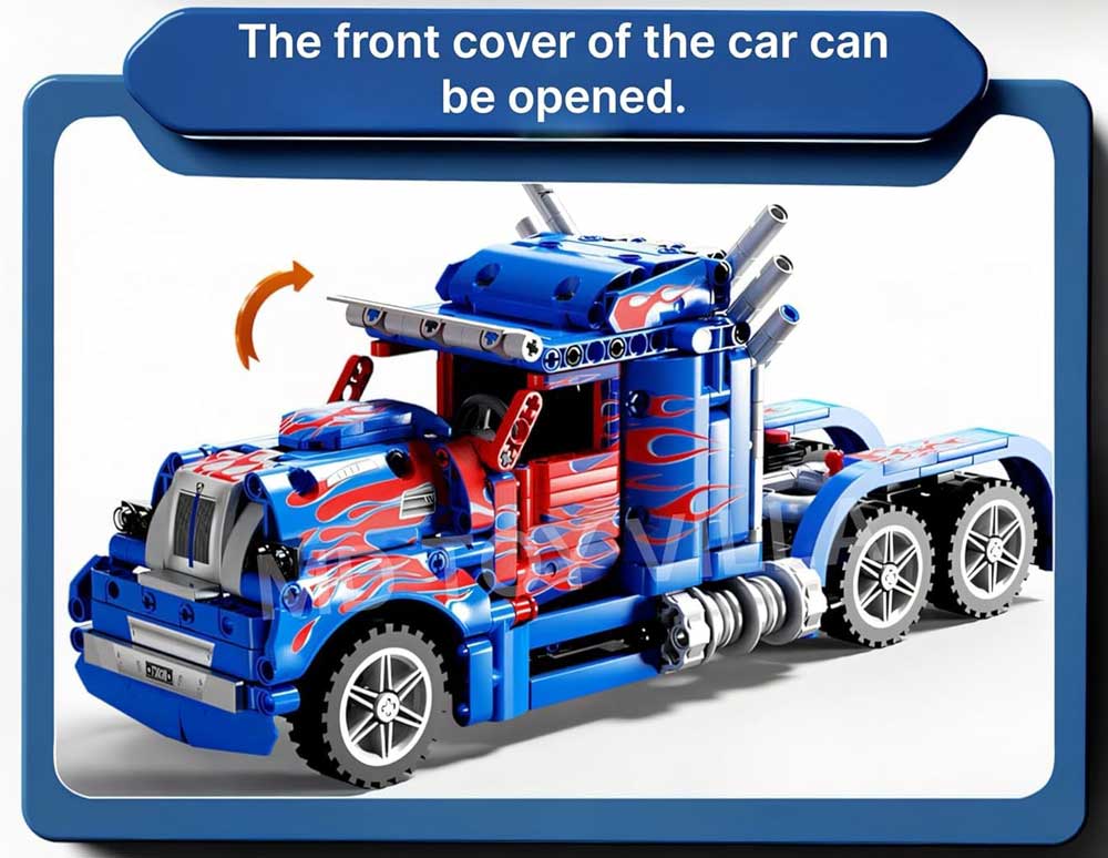 طراحی ظاهری این کامیون بر اساس خودروهای سنگین مسابقه‌ای یا صنعتی انجام شده و شامل جزئیاتی مانند کابین، سپر، سیستم چرخ‌ها و ساختار مقاوم بدنه است. تناسب دقیق قطعات باعث می‌شود پس از ساخت، کامیون ظاهری حرفه‌ای، جذاب و بسیار نزدیک به مدل‌های واقعی داشته باشد.