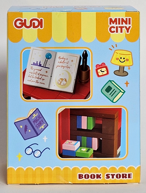 لگو کتابفروشی Gudi mini city book store 40801H یک مجموعه فانتزی ساختنی بلوکی است که شامل 104 قطعه میباشد. این مجموعه به کاربر این امکان را میدهد تا سازهای از نوع کتاب فروشی کوچک با نمای بخش داخلی و فضای بیرونی را با استفاده از قطعات رنگی و طراحی خیابانی بسازد.