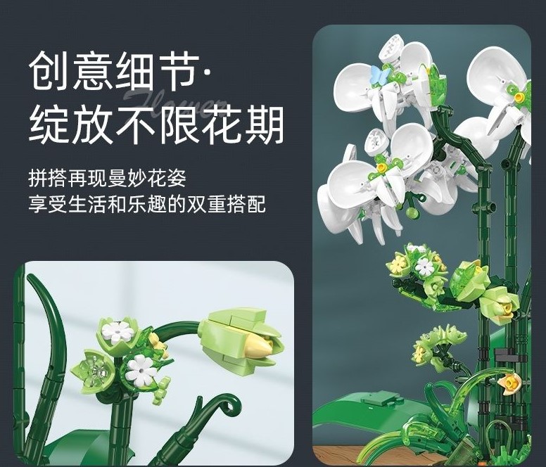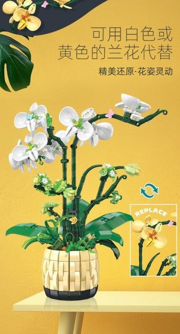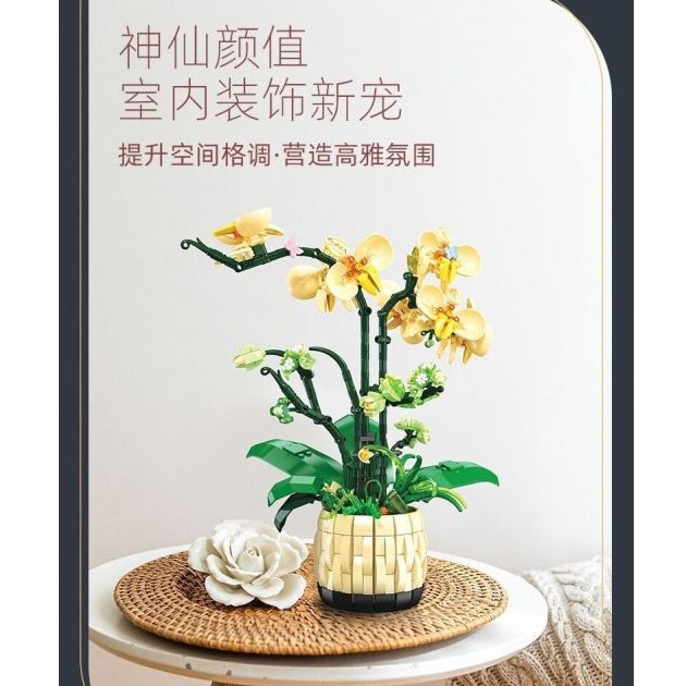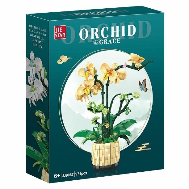 الهام اصلی این مجموعه از زیبایی طبیعی گلهای ارکیده گرفته شده است. گلبرگهای سفید و زرد با جزئیات دقیق و رنگبندی طبیعی ساخته شدهاند تا حس واقعی بودن را منتقل کنند. گلدان لگویی با طرح بافت حصیری و رنگهای کرم و مشکی، جلوهای شیک و مدرن به این مدل میبخشد.