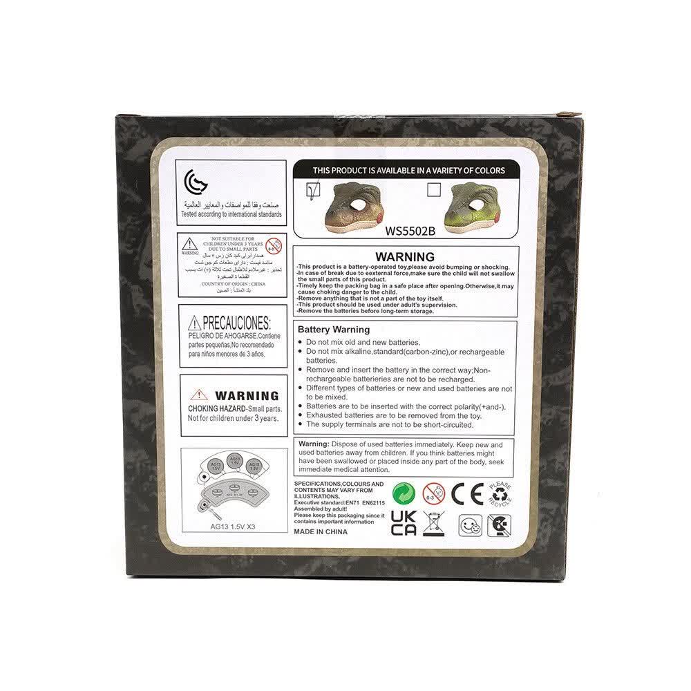 این محصول با سه عدد باتری دکمهای AG13 (1.5V) کار میکند که در محفظه ایمن پشتی قرار میگیرند. با فعالسازی قابلیت صوتی، صداهای دایناسوری و موزیک پخش میشود که کودک را در نقش خود غرق میکند. بر روی جعبه محصول سه ویژگی اصلی ذکر شده است: Wear It (پوشیدن آن)، Music (موزیکال بودن) و Play (بازی کردن). این ماسک ابزاری عالی برای تقویت قوه تخیل و اجرای نمایشهای خانگی است.