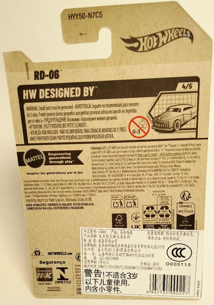 این مدل شماره ۴ از ۵ در سری HW Designed By است. این سری به برجستهترین طراحیهای داخلی تیم هات ویلز اختصاص دارد. RD-06 شاهکاری از Mark Jones است که نشان میدهد چگونه یک ماشین خیالی میتواند از خودروهای واقعی جذابتر باشد. لوگوی بنفش رنگ این سری در گوشه راست کارت، ارزش کلکسیونی آن را دوچندان کرده است.
