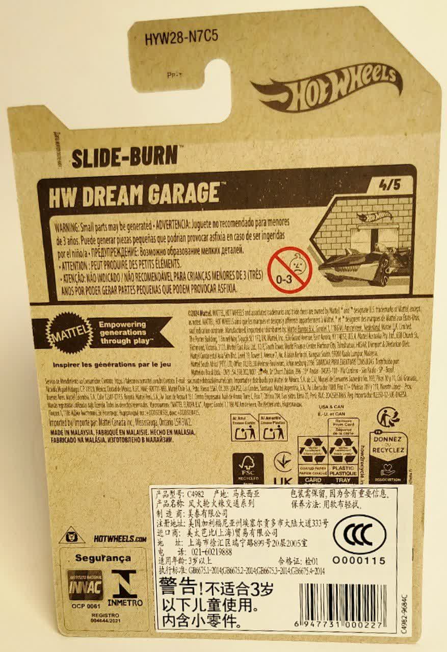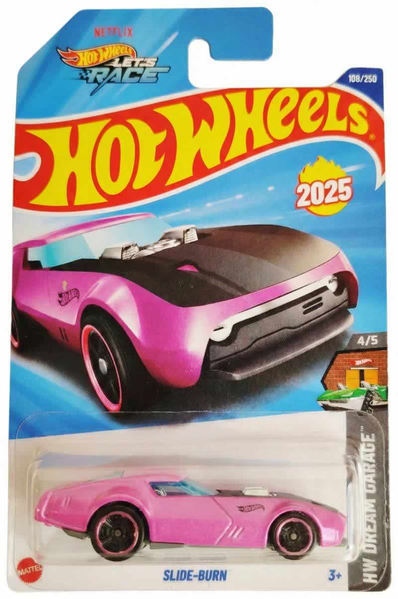 ماشین فلزی هات ویلز اسلاید برن Slide-Burn با کد کلکسیونی ۱۰۸/۲۵۰ و به عنوان چهارمین مدل از سری ۵ تایی HW Dream Garage در سال ۲۰۲۵ عرضه شده است.طراحی این ماشین ترکیبی از یک خودروی عضلانی کلاسیک و تکنولوژی دریفت مدرن است. بدنه این مدل با رنگ خاص صورتی و کاپوت، سقف و صندوق عقب مشکی مات طراحی شده که ظاهری بسیار تهاجمی و اسپرت به آن داده است. اگزوزهای جانبی که از زیر دربها بیرون زدهاند، نشان از قدرت موتور این هیولا دارند. همچنین وجود لوگوی انیمیشن "Netflix Let's Race" روی بستهبندی، جذابیت آن را برای کودکان دوچندان کرده است. اسلاید برن انتخابی عالی برای کسانی است که عاشق هیجان و سرعت هستند.