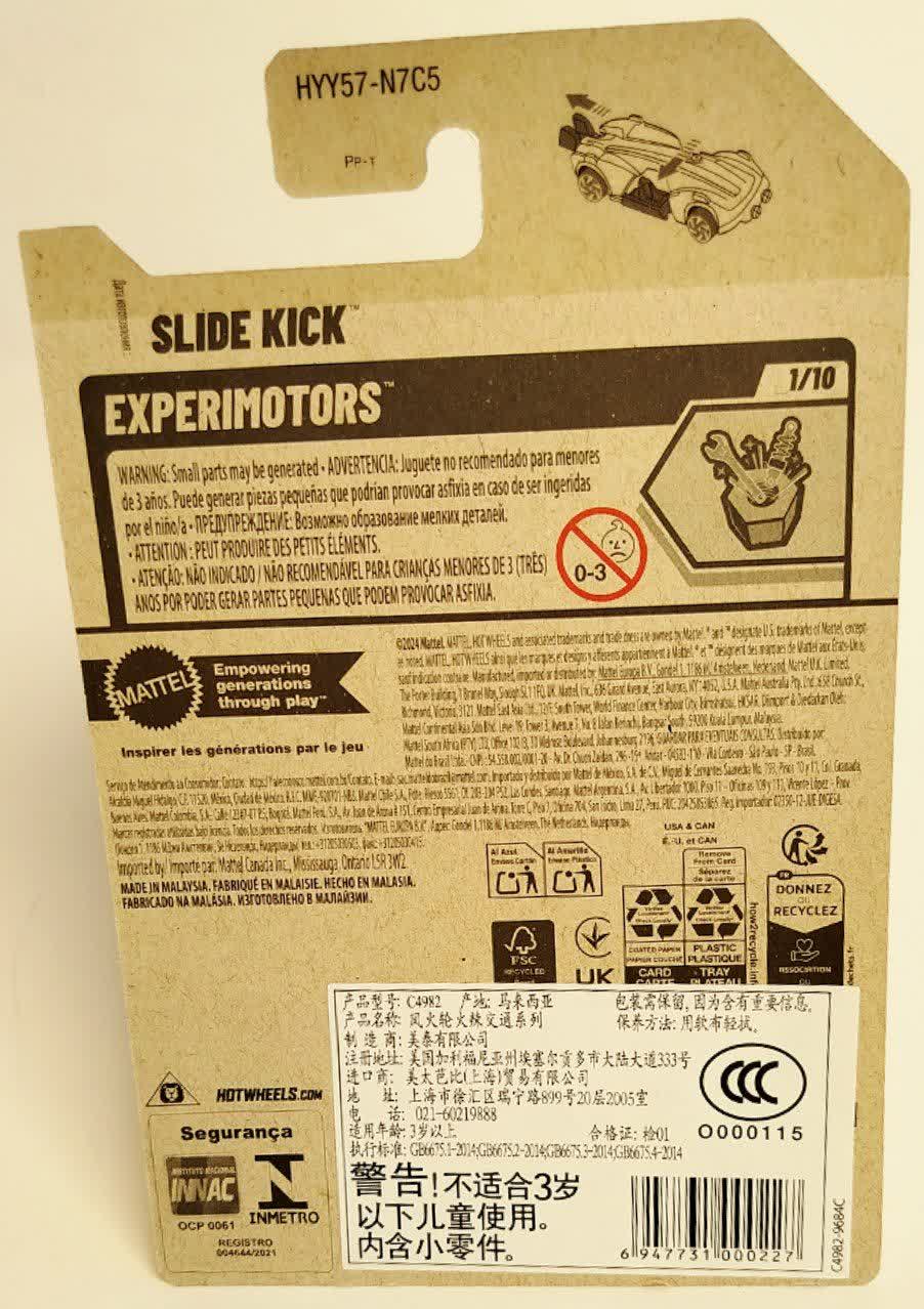 ماشین فلزی هات ویلز اسلاید کیک Slide Kick عضوی از خانواده خلاق Experimotors است که همیشه یک سورپرایز مکانیکی برای شما دارند. این محصول با کد کلکسیونی ۱۱۶/۲۵۰ و به عنوان اولین مدل از سری ۱۰ تایی Experimotors در سال ۲۰۲۵ عرضه شده است.بدنه این ماشین با رنگ طلایی مات و خطوط گرافیکی قرمز و سفید طراحی شده که ظاهری لوکس و اسپرت به آن بخشیده است. اما ویژگی اصلی اسلاید کیک، نام آن است: "Slide" به معنای لغزیدن. در داخل کابین این ماشین، صندلی راننده قابلیت حرکت و جابجایی دارد که یک ویژگی تعاملی جذاب برای کودکان است. روی بستهبندی این مدل نیز لوگوی انیمیشن "Netflix Let's Race" دیده میشود که نشاندهنده حضور این ماشین در ماجراجوییهای کارتونی جدید هات ویلز است.