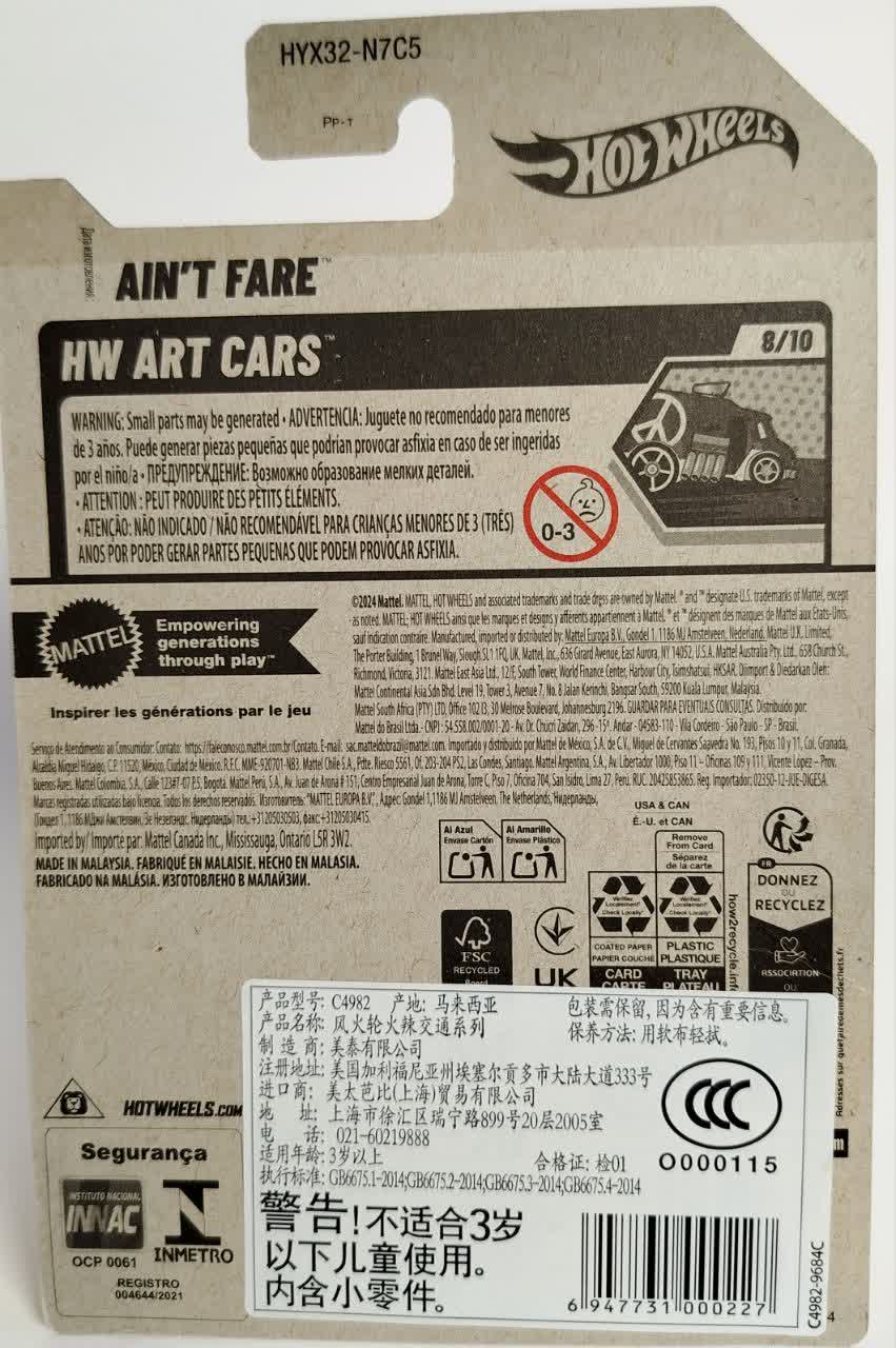 مدل Ain't Fare یکی از قالبهای نسبتاً جدید و بسیار محبوب هات ویلز است که برای اولین بار در سال ۲۰۱۷ معرفی شد. این اتوبوس که ارتفاع کمی از سطح زمین دارد، نمادی از حملونقل عمومی مدرن است که با چاشنی تیونینگ و هنر ترکیب شده است. نسخه سال ۲۰۲۵ در سری HW Art Cars، با ظاهری کاملاً هنری و "Street Style" عرضه شده است.