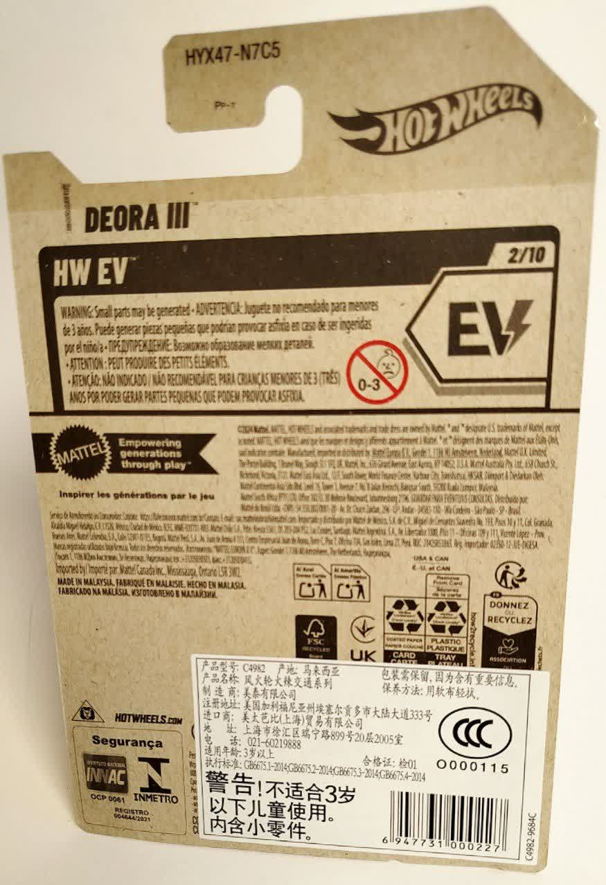 این ماشین شماره ۲ از ۱۰ در سری HW EV است. این سری مختص خودروهای الکتریکی (Electric Vehicles) است و هات ویلز با قرار دادن دئورا ۳ در این دسته، پیام مهمی میدهد: حتی اسطورههای کلاسیک هم میتوانند برقی و دوستدار محیط زیست باشند. لوگوی سبز رنگ EV روی کارت، نماد این تکنولوژی است.