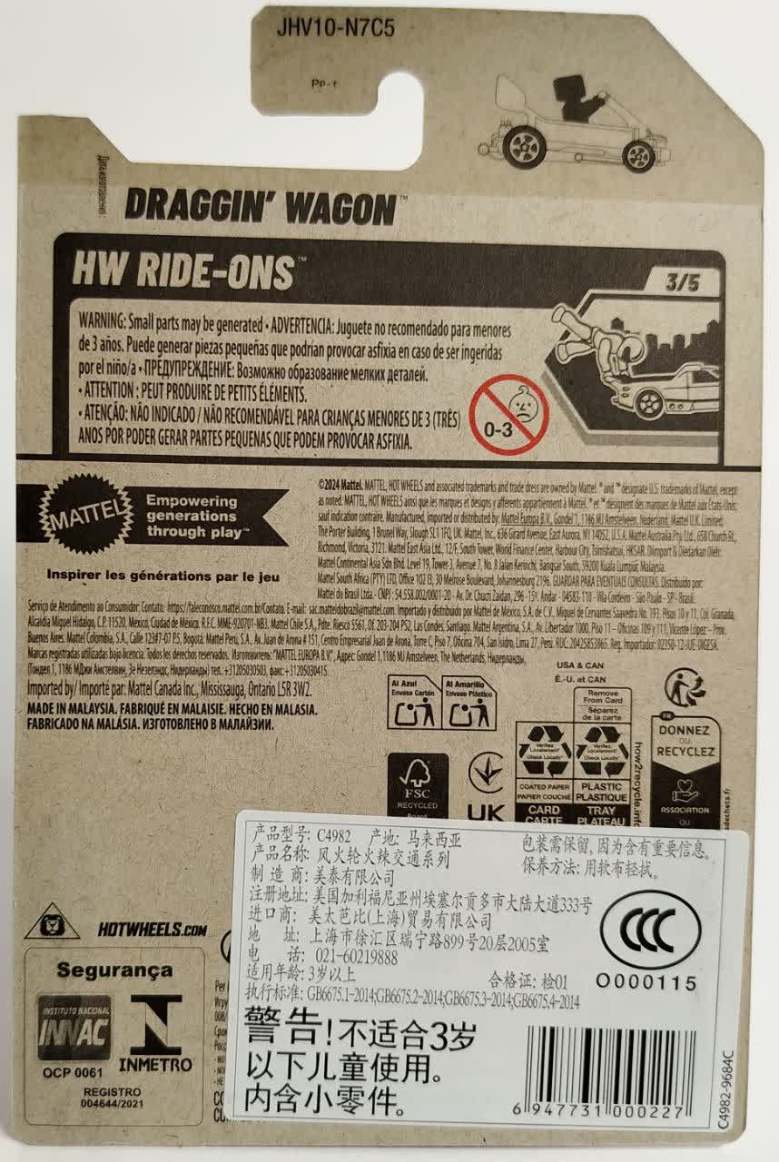 ماشین فلزی هات ویلز درگین واگن Draggin Wagon ترکیبی نوستالژیک از واگنهای دستی قدیمی و هیجان مسابقات اتومبیلرانی است. این محصول با کد کلکسیونی ۶۸/۲۵۰ و به عنوان سومین مدل از سری ۵ تایی HW Ride-Ons در سال ۲۰۲۵ عرضه شده است. این مدل دارای بدنهای به رنگ بنفش خوشرنگ است که با دستگیره هدایتکننده سفید و موتور کرومی در عقب تزیین شده است. نام "Draggin' Wagon" بازی با کلمات است که هم به "کشیدن واگن" و هم به "مسابقه درگ" اشاره دارد. ویژگی اصلی این سری، طراحی صندلی و دستگیره به گونهای است که میتوانید آدمکهای لگو (LEGO) خود را درون آن بنشانید و آنها را به رانندگان مسابقه تبدیل کنید.