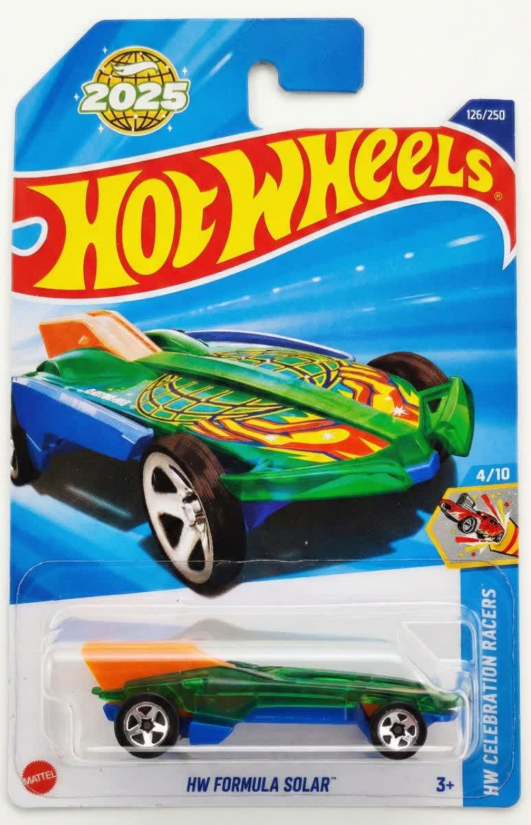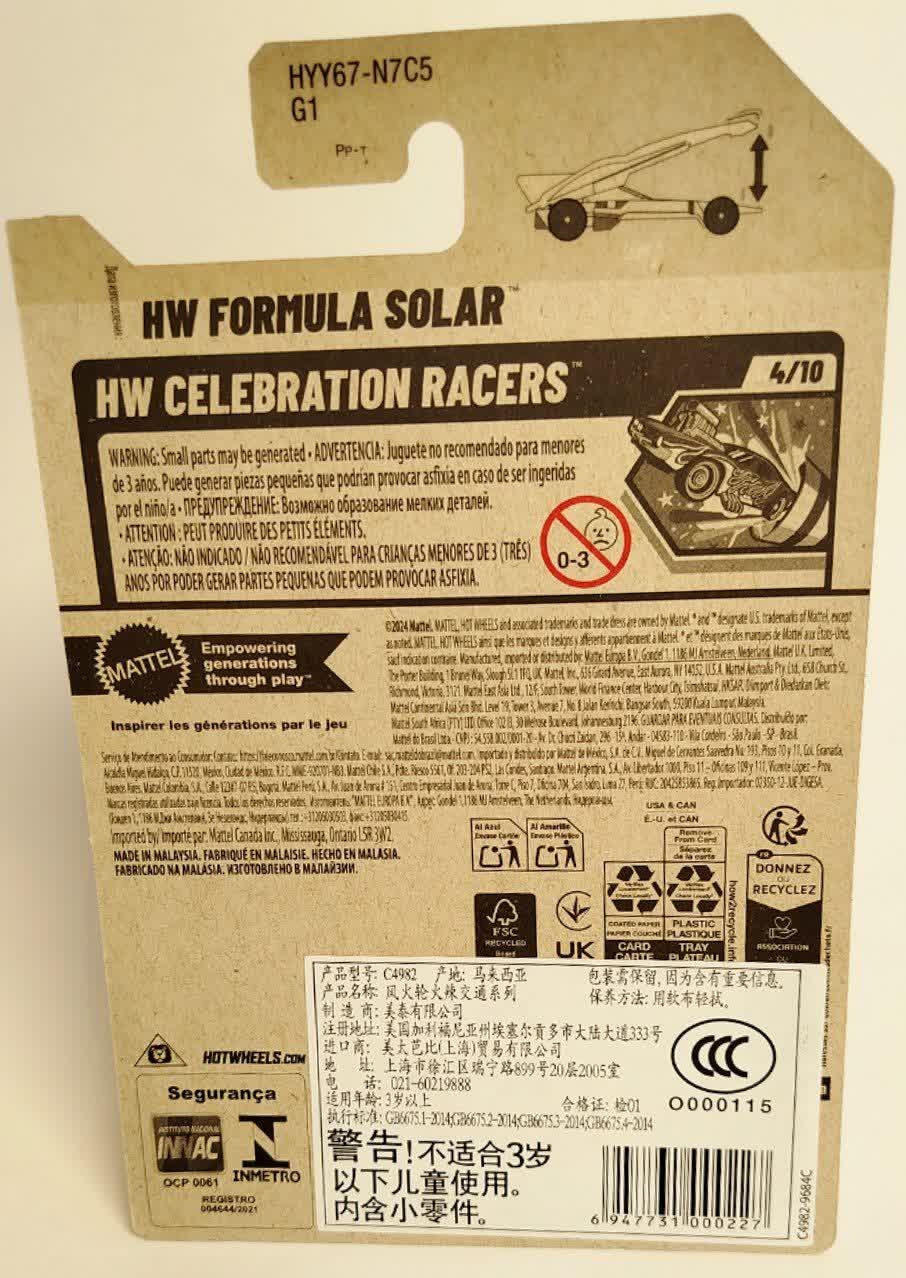 این مدل شماره ۴ از ۱۰ در سری HW Celebration Racers است. این سری به ماشینهایی اختصاص دارد که با رنگهای شاد و طرحهای گرافیکی جشنگونه تزیین شدهاند. روی بدنه فرمولا سولار نیز طرحهای انتزاعی زرد و قرمز دیده میشود که حس پویایی و شادی را القا میکنند. لوگوی Earth (کره زمین) در گوشه بالای کارت، به ماهیت جهانی و دوستدار محیط زیست بودن این ماشین اشاره دارد.