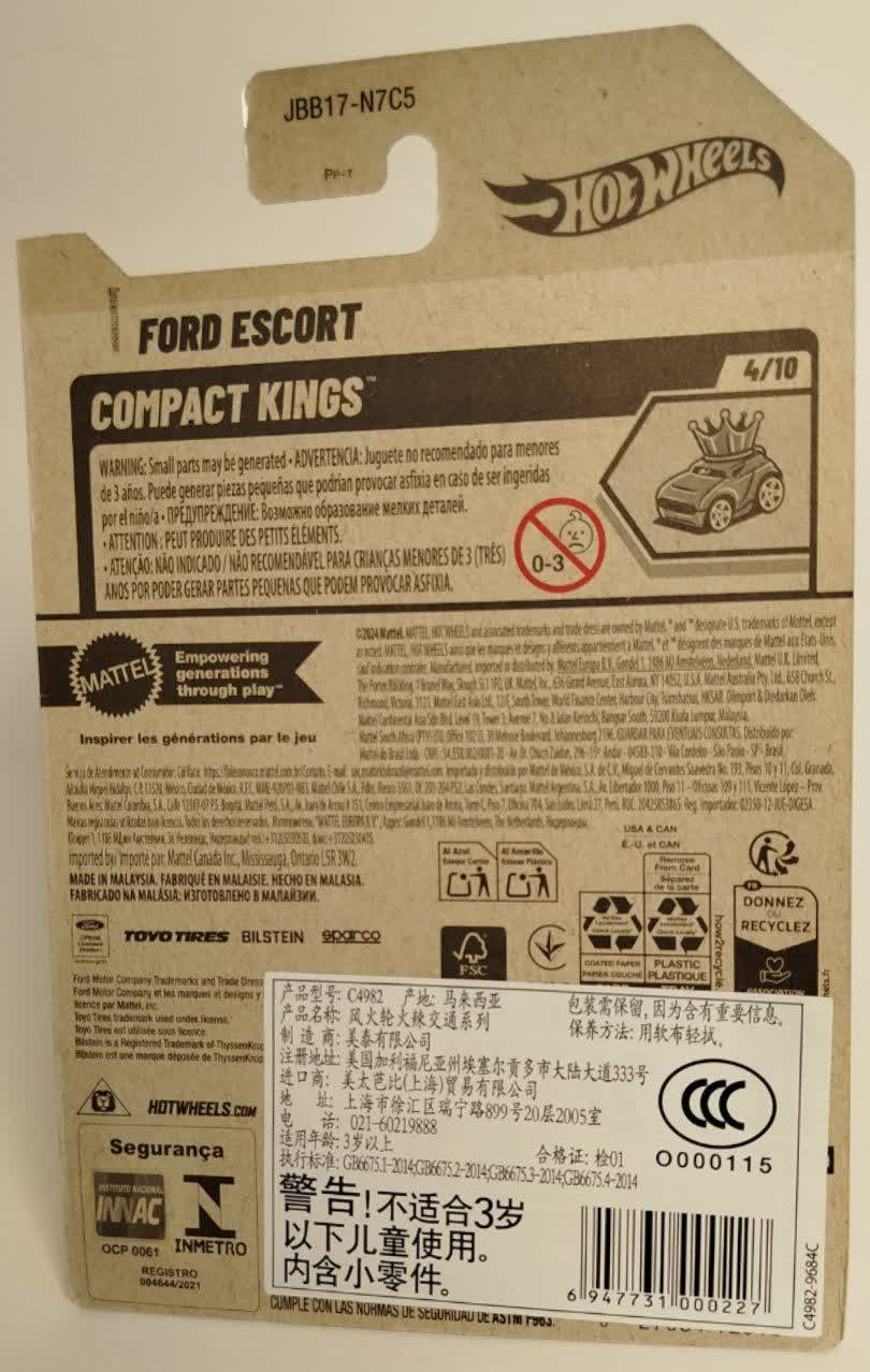 ماشین فلزی هات ویلز فورد اسکورت Ford Escort عضوی از سری محبوب Compact Kings سال ۲۰۲۴ است که با شماره ۴ از ۱۰ در این سری و شماره ۱۱۳ از ۲۵۰ در کل مجموعه هات ویلز عرضه شده است. طراحی این مدل بر اساس خودروهای افسانهای رالی فورد اسکورت انجام شده که با رنگ مشکی براق، چراغهای رالی برجسته روی کاپوت و شماره مسابقه ۱۷، جلوهای خشن و اسپرت به خود گرفته است. کیفیت ساخت کمپانی متل (Mattel) در این محصول کاملاً مشهود است. بدنه فلزی دایکست مقاوم، رینگهای اسپرت و جزئیات دقیق گرافیکی، این ماشین را نه تنها برای بازی کودکان بالای ۳ سال، بلکه برای ویترین کلکسیونرهای حرفهای نیز ایدهآل کرده است. این فورد اسکورت کوچک، نمادی از سرعت و قدرت در پیستهای خاکی است که حالا آماده است تا در خانه شما گرد و خاک به پا کند. با خرید این محصول، شما فقط یک اسباببازی نمیخرید، بلکه تکهای از تاریخ اتومبیلرانی را به خانه میبرید.