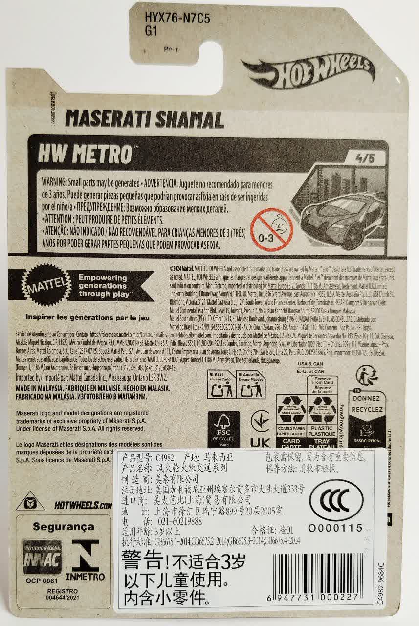 این مدل شماره ۴ از ۵ در سری HW Metro است. این سری معمولاً شامل خودروهای خدمات شهری (مثل تاکسی و پلیس) یا خودروهای سواری شهری است. حضور مازراتی شامال در این سری، نشاندهنده جنبه "گرند تورینگ" و قابلیت استفاده شهری این سوپراسپرت در زمان خود بوده است. لوگوی این سری با نماد ساختمانهای شهر روی بستهبندی دیده میشود.