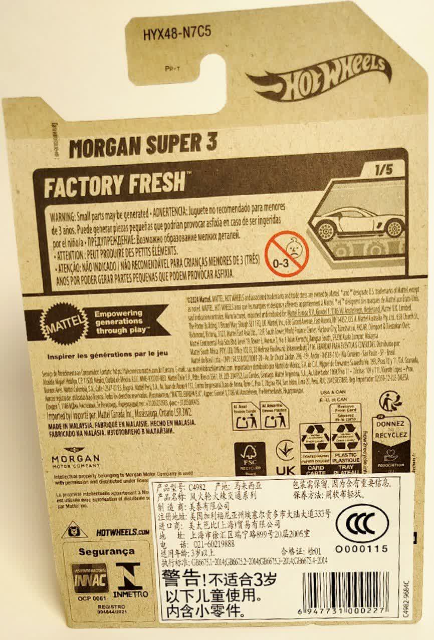 این مدل شماره ۱ از ۵ در سری Factory Fresh است. این سری مخصوص ماشینهایی است که با ظاهر استاندارد کارخانهای یا با لیوریهای رسمی خودروساز تولید میشوند. قرار گرفتن مورگان سوپر ۳ در صدر این لیست، نشاندهنده اهمیت این مدل جدید در بازار خودروهای اسپرت است. کد ۱۵/۲۵۰ نشان میدهد که این مدل یکی از اولین ماشینهای عرضه شده در سری جدید سال ۲۰۲۵ است و پیدا کردن آن در ابتدای سال هیجانانگیز است.
