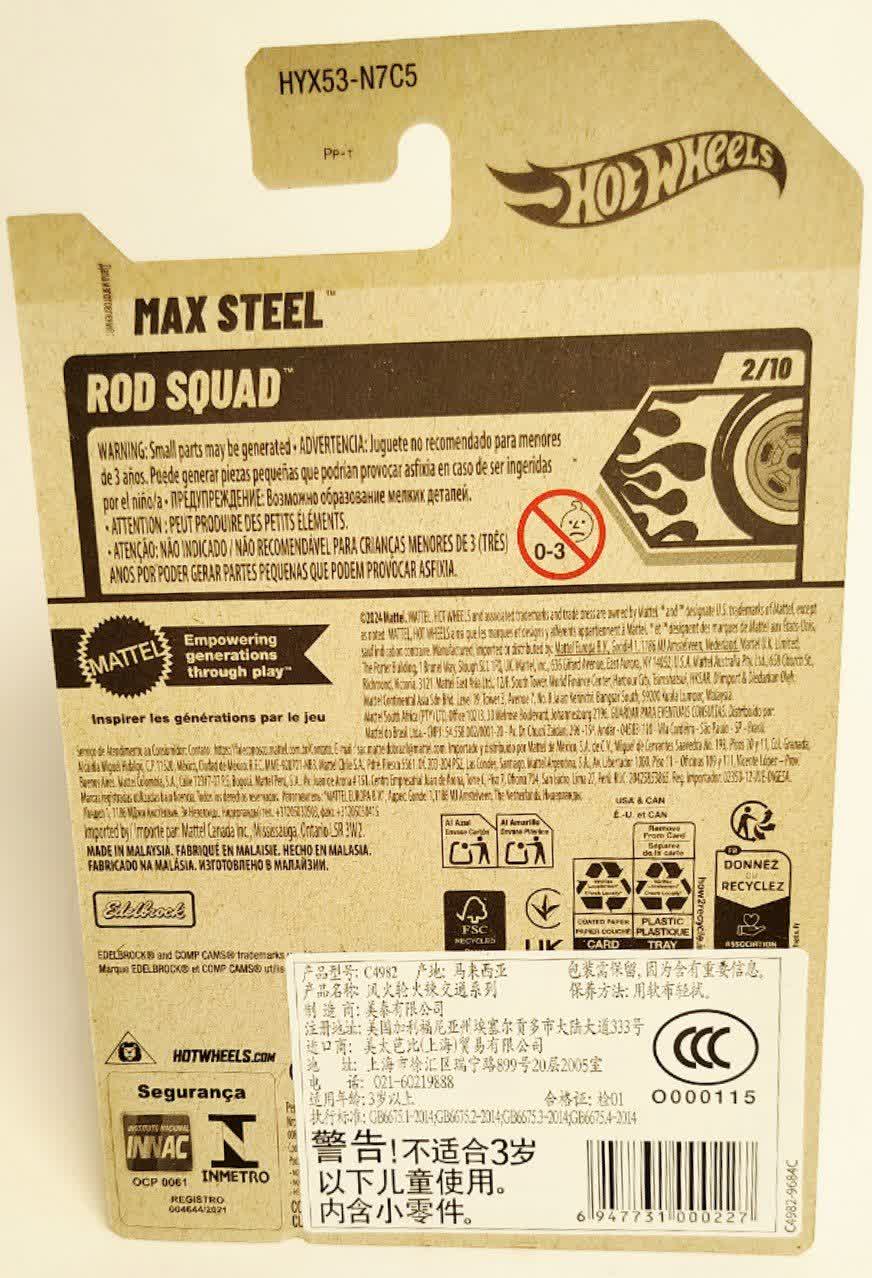 این مدل عضوی از خانواده Rod Squad است؛ سریای که به خودروهای کلاسیک تقویتشده و هاترادهای خیابانی اختصاص دارد. قرار گرفتن مکس استیل در ردههای اول این سری (شماره ۲ از ۱۰)، نشاندهنده اهمیت این طراحی کلاسیک است. چرخهای این مدل از نوع کلاسیک با رینگ قرمز و لاستیک مشکی هستند که دقیقاً استایل ماشینهای مسابقهای قدیمی را تداعی میکنند.