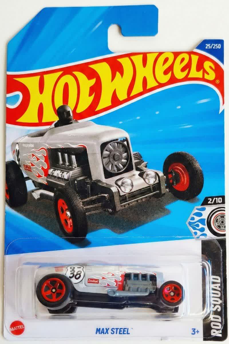 ماشین فلزی هات ویلز مکس استیل Max Steel که با کد کلکسیونی ۲۵/۲۵۰ و به عنوان دومین ماشین از سری ۱۰ تایی Rod Squad در سال ۲۰۲۵ عرضه شده، ترکیبی از استایل رترو و قدرت خام است.طراحی این ماشین به سبک خودروهای مسابقهای دهه ۳۰ میلادی است، اما با بدنهای از جنس فلز صیقلخورده یا نقرهای مات که با شعلههای قرمز و سفید تزیین شده است. ویژگی متمایز مکس استیل، فن بزرگ خنککننده در جلوی رادیاتور و چرخهای کلاسیک قرمز رنگ است که ظاهری منحصر به فرد به آن بخشیده است. این مدل برای کلکسیونرهایی که عاشق ماشینهای "هات راد" هستند، یک گنجینه واقعی است.