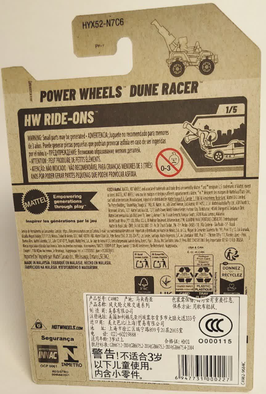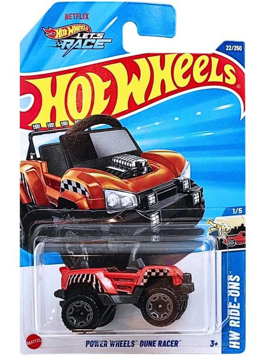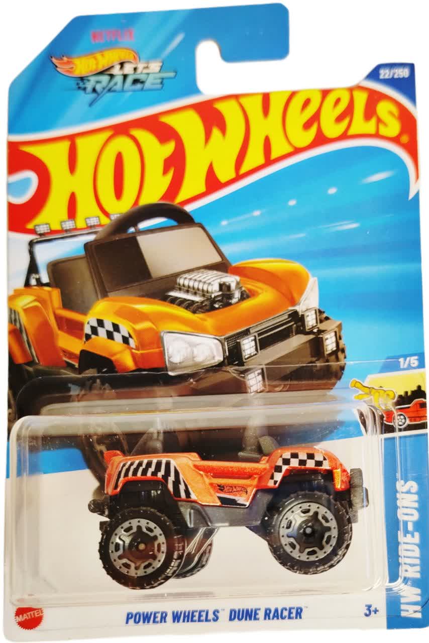 ماشین فلزی هات ویلز پاور ویلز دون ریسر Power Wheels Dune Racer که با کد کلکسیونی ۲۲/۲۵۰ و به عنوان اولین مدل از سری ۵ تایی HW Ride-Ons عرضه شده، نمونه‌ای کوچک شده از ماشین‌های شارژی واقعی کودکان است. طراحی این ماشین به رنگ نارنجی پرتقالی با رول‌کیج (محافظ) مشکی و جزئیات کرومی موتور، ظاهری اسپرت و صحرایی به آن داده است. نکته شگفت‌انگیز درباره سری HW Ride-Ons این است که صندلی‌های این ماشین‌ها به گونه‌ای طراحی شده‌اند که می‌توانید مینی‌فیگورهای محبوب خود را درون آن‌ها بنشانید و بازی را هیجان‌انگیزتر کنید. وجود لوگوی "Netflix Let's Race" روی بسته‌بندی نیز نشان می‌دهد که این مدل در انیمیشن‌های جدید هات ویلز حضور دارد.