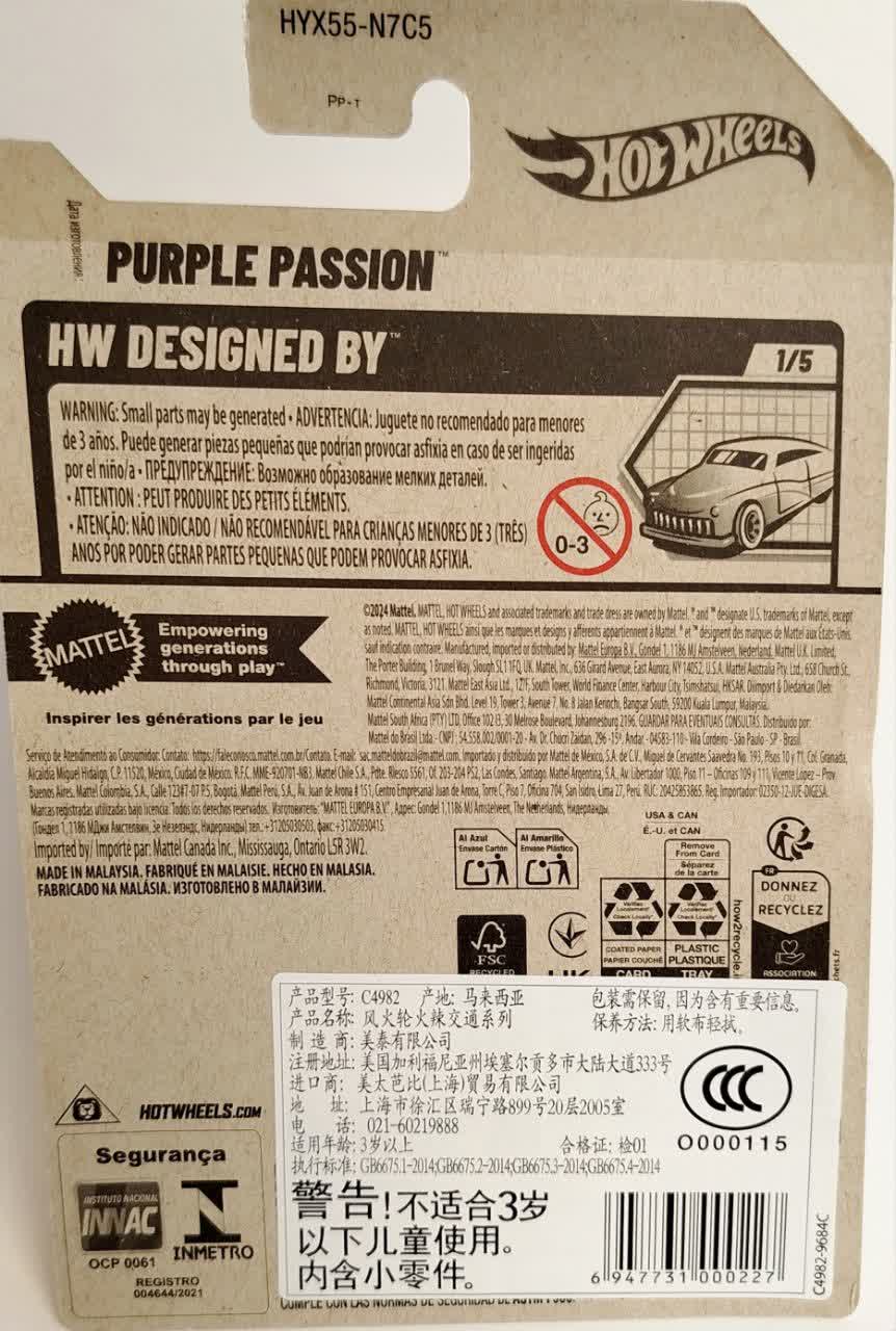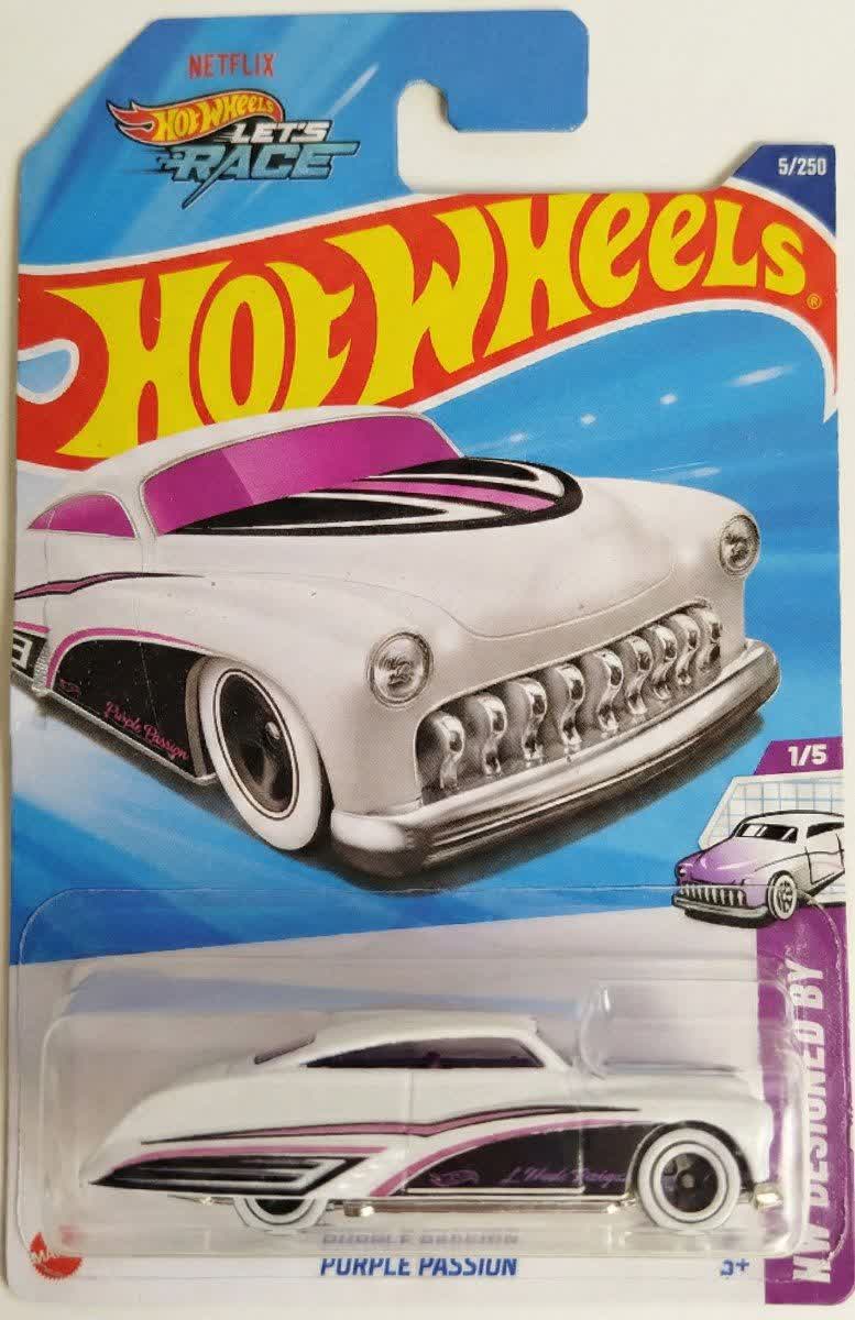 ماشین فلزی هات ویلز پرپل پشن Purple Passion یکی از نمادینترین و محبوبترین مدلهای تاریخ هات ویلز است که از سال ۱۹۹۰ تاکنون قلب کلکسیونرها را تسخیر کرده است. این محصول با کد کلکسیونی ۵/۲۵۰ و به عنوان اولین مدل از سری ۵ تایی HW Designed By در سال ۲۰۲۵ عرضه شده است.طراحی این ماشین بر اساس خودروهای کاستوم دهه ۵۰ میلادی انجام شده است. بدنه این نسخه با رنگ سفید صدفی و طرحهای گرافیکی منحنی به رنگ بنفش و مشکی روی کاپوت و کنارهها تزیین شده است. چرخهای این مدل دارای لاستیک دور سفید هستند که کلاسیک بودن آن را فریاد میزنند. لوگوی "Netflix Let's Race" روی بستهبندی نشان میدهد که این اسطوره قدیمی، حالا ستاره انیمیشنهای جدید کودکان نیز هست.