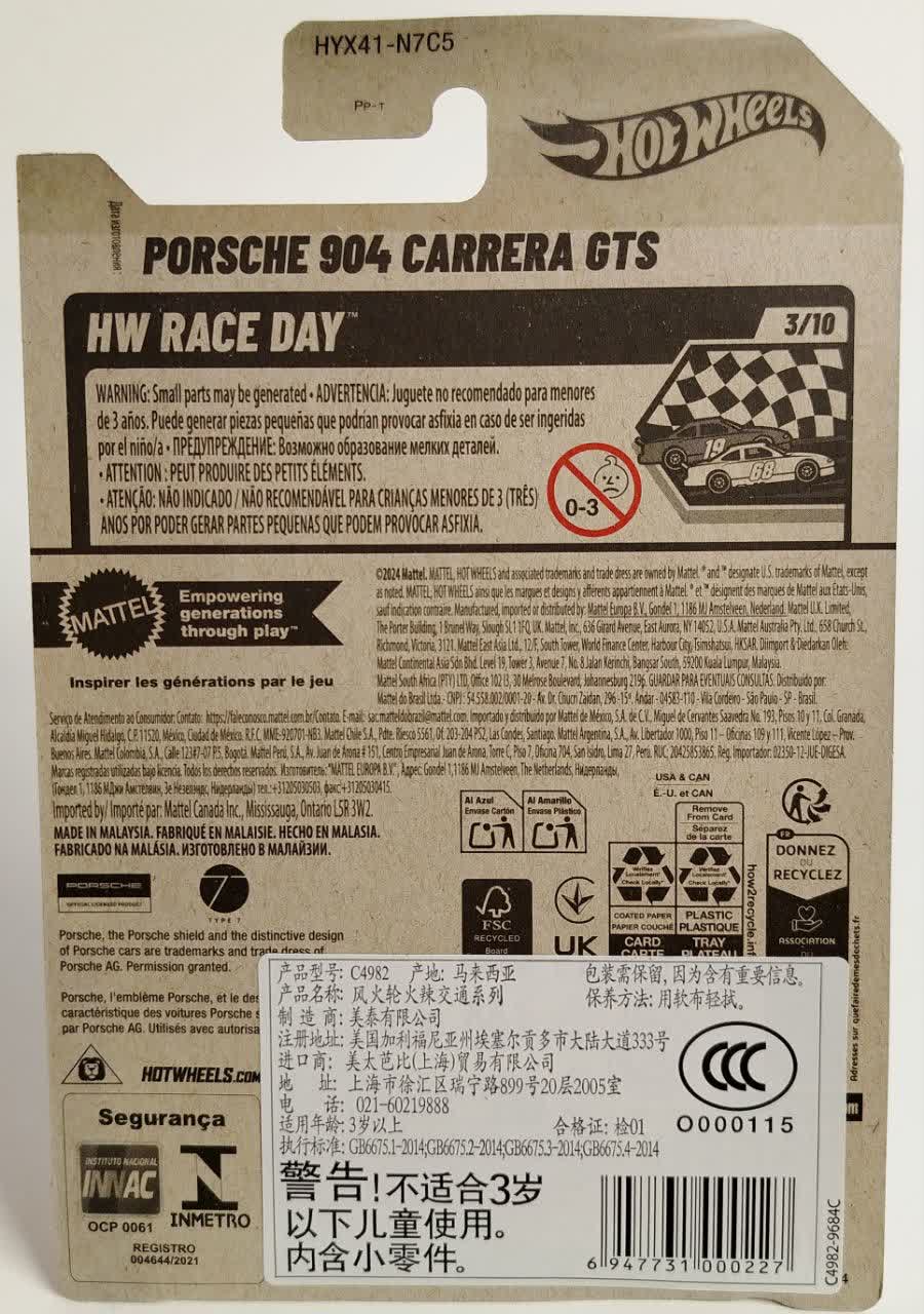 این مدل شماره ۳ از ۱۰ در سری HW Race Day است. این سری مختص خودروهایی است که تاریخساز پیستهای مسابقه بودهاند. پورشه ۹۰۴ با سابقه درخشان در مسابقات تارگا فلوریو و لمانز، ستاره بیچون و چرای این سری است. پرچم شطرنجی روی بستهبندی نماد این سری پرافتخار است.