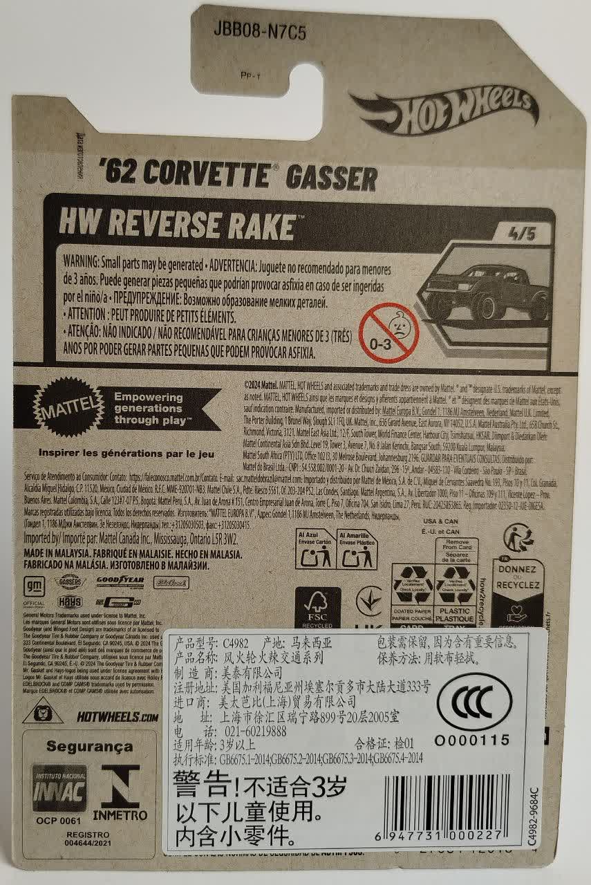 در تاریخ هات ویلز، مدلهای "Gasser" جایگاه ویژهای دارند و '62 Corvette یکی از محبوبترین آنهاست. گسرها خودروهایی بودند که در دهههای ۵۰ و ۶۰ میلادی با بالا بردن ارتفاع جلو و حذف وزن اضافی، برای مسابقات شتاب آماده میشدند. هات ویلز در سری HW Reverse Rake، این مفهوم را با ظاهری خیرهکننده بازسازی کرده است.