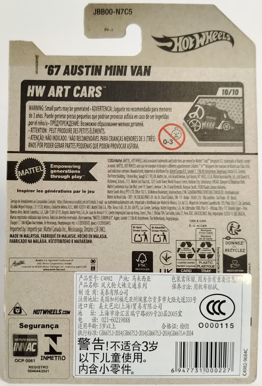 ماشین فلزی هات ویلز 67 آستین مینی ون 67Austin Mini Van ترکیبی از فرهنگ پاپ دهه ۶۰ و هنر مدرن است. این محصول با کد کلکسیونی ۱6۹/۲۵۰ و به عنوان دهمین و آخرین مدل از سری ۱۰ تایی HW Art Cars در سال ۲۰۲۵ عرضه شده است.این ماکت بر اساس نسخه "ون" (Panel Van) خودروی محبوب مینی کوپر ساخته شده است. رنگ بدنه نارنجی سیر است که با گرافیکهای جسورانه پرچم انگلستان (Union Jack) به رنگهای آبی و سفید تزیین شده است. کلمه "MINI" به صورت هنری در بین طرحهای گرافیکی پنهان شده است. رینگهای خاص با لبه آبی متالیک و سپرهای آبی رنگ، تضاد رنگی فوقالعادهای ایجاد کردهاند. به عنوان مدل شماره ۱۰/۱۰، این ماشین تکمیلکننده پیام مخفی سری Art Cars است.
