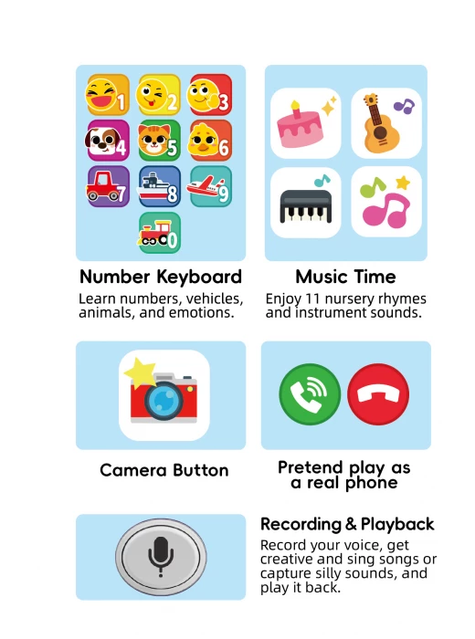 - تقویت مهارتها: بازی با این تلفن اسباببازی به تقویت مهارتهای حرکتی ظریف (با فشار دادن دکمهها)، هماهنگی چشم و دست، حافظه شنیداری و توسعه گفتار کودک کمک میکند.