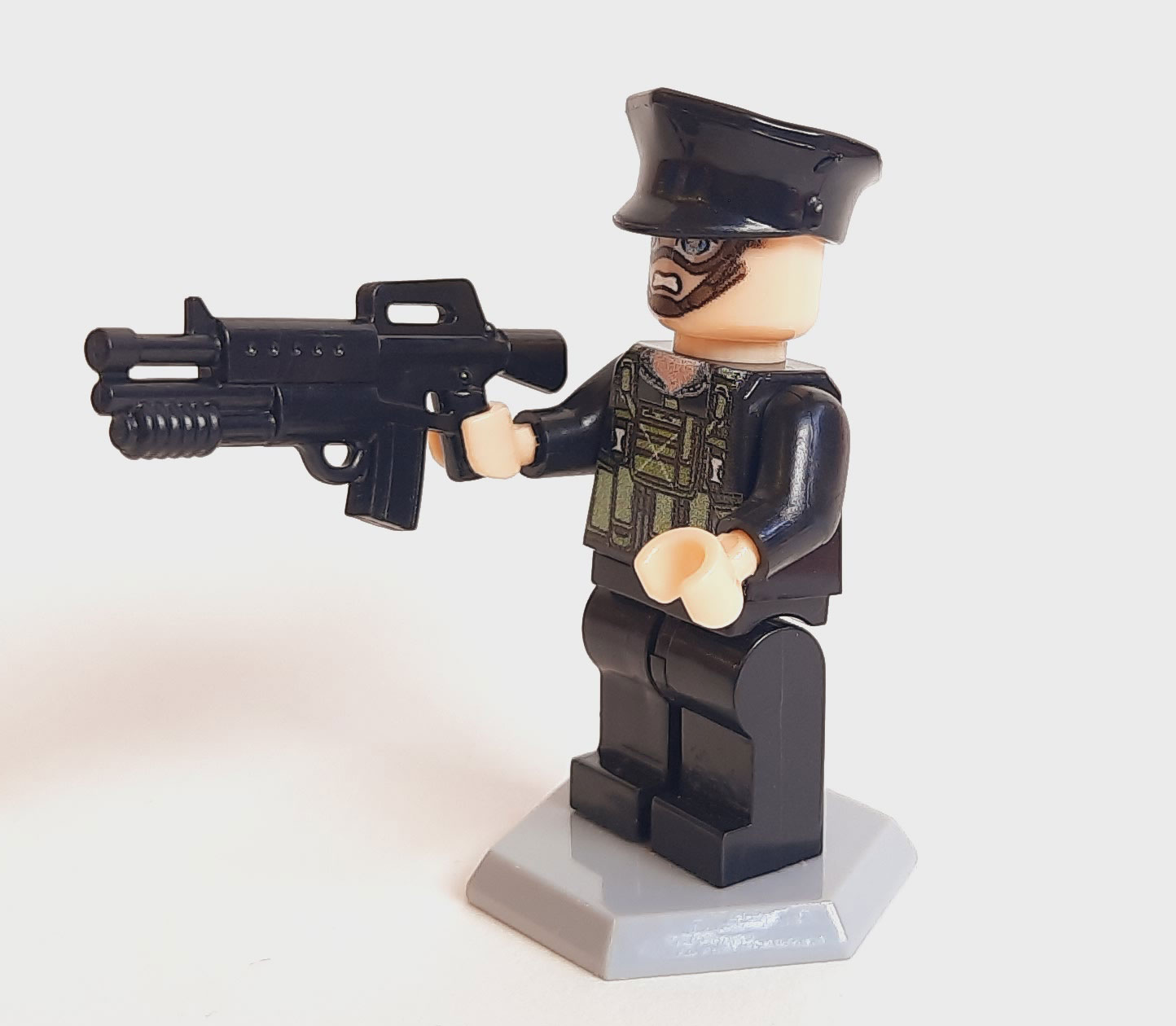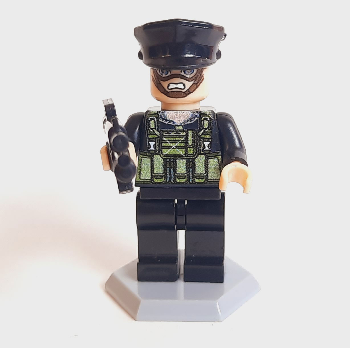این مینی فیگور لگویی پلیس ضد شورش با لباس مشکی سبز و کلاه مشکی طراحی شده تا ظاهر یک نیروی ویژه شهری را بازآفرینی کند. وجود ماسک محافظ، چاپ دقیق روی لباس و مدلسازی منظم اجزا، جذابیت ظاهری فیگور را افزایش داده و آن را برای صحنهسازیهای اکشن، داستانپردازی و کلکسیونهای پلیسی مناسب میکند. همراه این محصول یک تفنگ نیز ارائه میشود که نوع آن در هر بستهبندی بهصورت رندوم قرار میگیرد و میتواند میان مدلهای مختلف تاکتیکی تغییر کند. این فیگور گزینهای عالی برای طرفداران ماجراجویی، ساخت دیوراما یا تکمیل تیمهای پلیسی در مجموعههای لگویی است.
