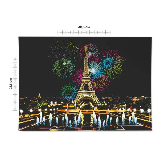نقاشی خراشیدنی Scratch Fireworks Paris دارای طرح باشکوهی از منظره‌ی آتش بازی پاریس است. برج‌ها، سازه‌های معماری مدرن، پل‌های شهری و نورهای درخشان، همگی با ظرافت و طراحی دقیق روی صفحه نقش شده‌اند. کشف تدریجی این تصویر همان چیزی است که این سرگرمی را آرام‌بخش، لذت‌بخش و اعتیادآور می‌کند.