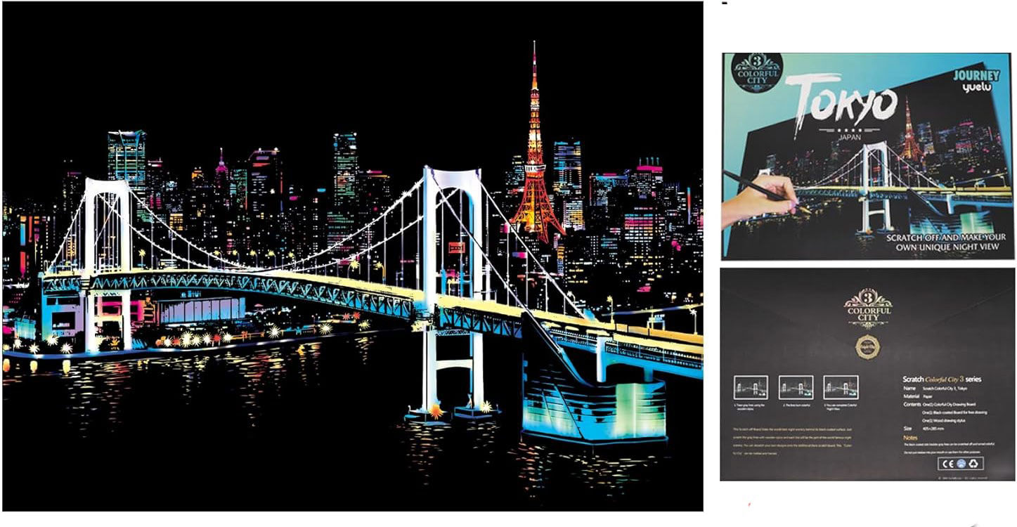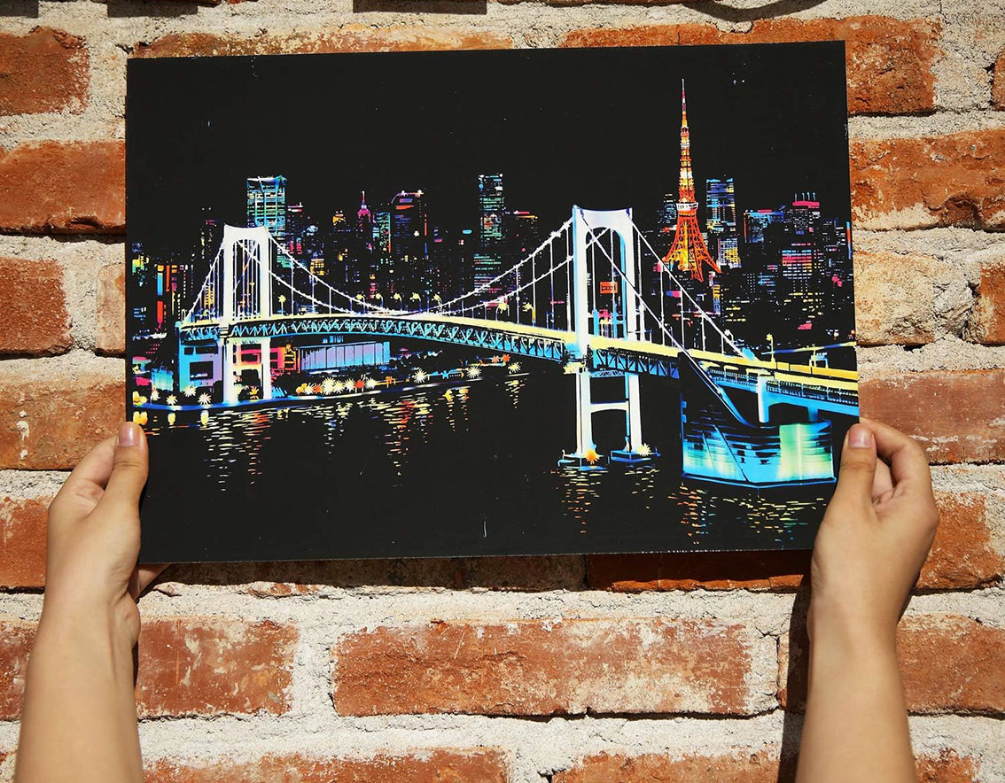 نقاشی خراشیدنی رنگینکمانی طرح شهر توکیو یک تجربه هنری متفاوت و لذتبخش است. این محصول بدون نیاز به رنگ، مداد یا ابزارهای پیچیده ساخته شده و تنها با یک قلم خراش، هنرمند را وارد دنیایی از رنگهای زنده و جذاب میکند. سطح مشکی رنگ کاغذ باعث میشود طرحهای نورپردازی شبانه شهر توکیو به شکل خیرهکنندهای دیده شوند.