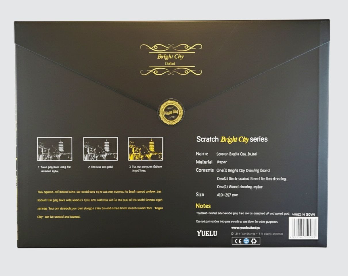 بسته اصلی نقاشی اسکراچ طرح شهر روشن دبی شامل یک ورق طرحدار، یک ورق ساده و ابزار خراش است.
