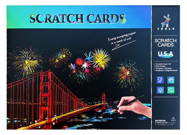 بسته اصلی نقاشی اسکراچ طرح شهر زیبا آمریکا شامل ورق طرحدار و ابزار خراش است.