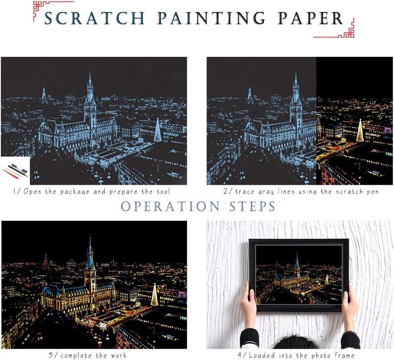 اسکراچ برد (نقاشی خراشیدنی) طرح هامبورگ آلمان yuelu Scratch Humburg Germany یک سرگرمی هنری آرامبخش و چشمنواز برای تمام سنین است. این اثر بهصورت یک صفحهی مشکی با لایهی طلایی یا رنگی در زیر، ارائه میشود که با خراش دادن خطوط مشخص، تصویر درخشان شهر هامبورگ نمایان میشود. شما بدون نیاز به مهارت نقاشی، میتوانید یک اثر هنری چشمگیر و قابل قابکردن خلق کنید.این محصول مناسب تزیین اتاق، هدیه، سرگرمی گروهی، کلاسهای هنر و کاهش استرس است. همچنین به دلیل وجود جزئیات دقیق برجها و افکت نورهای شهری، تکمیل آن حس لذتبخش ساخت یک اثر هنری واقعی را منتقل میکند. کافیست قلم مخصوص را به آرامی روی خطوط مشخص حرکت دهید و کمکم نمای زیبای هامبورگ زیر نور شب آشکار میشود.