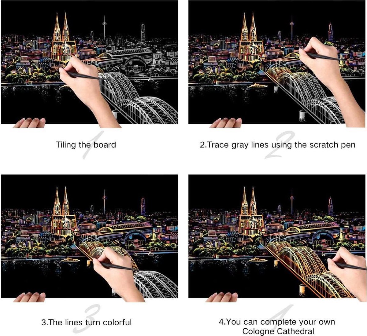 نقاشی خراشیدنی Scratch Cologne Cathedral دارای طرح باشکوهی از منظرهی کلیسای کلن است. برجها، سازههای معماری، پلهای شهری و نورهای درخشان، همگی با ظرافت و طراحی دقیق روی صفحه نقش شدهاند. کشف تدریجی این تصویر همان چیزی است که این سرگرمی را آرامبخش، لذتبخش و اعتیادآور میکند.
