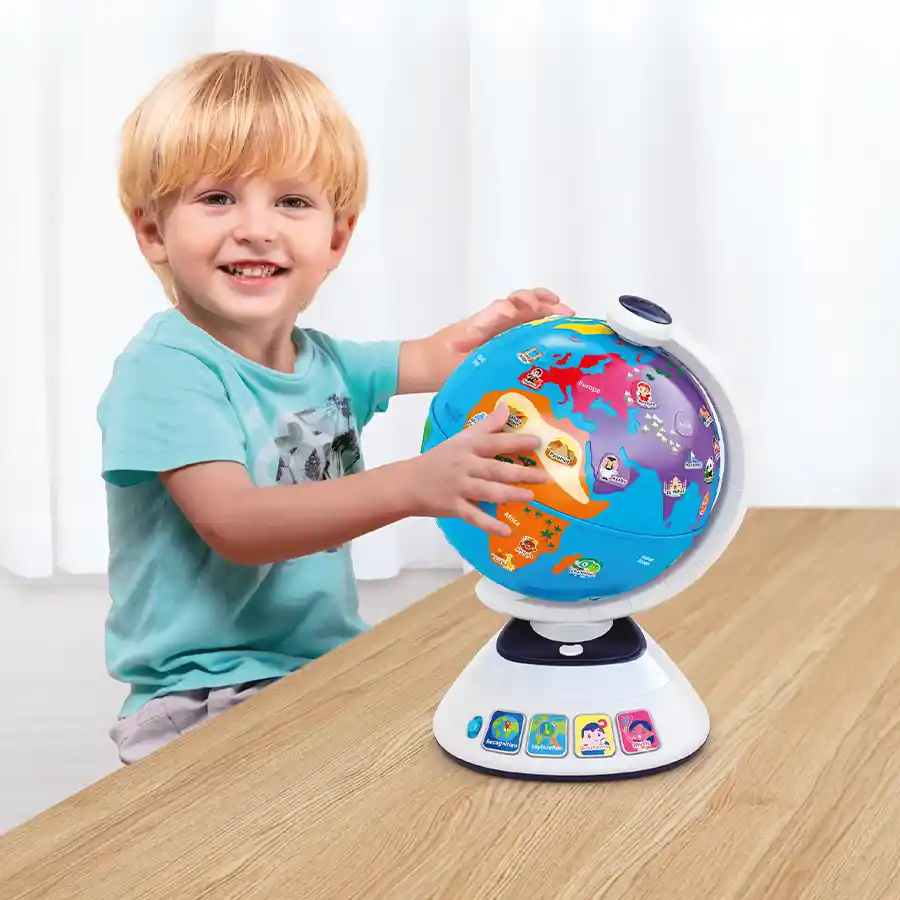 اسباب بازی کره زمین موزیکال هولی تویز Hola Toys Touch & Discover Globe HE8985 یک اسباب بازی سرگرم کننده و هیجان انگیز برای کودکان 3 سال به بالا می باشد.یکی از دغدغه های اصلی بسیاری از والدین، یادگیری کودکان به وسیله اسباب بازی ها، در عین سرگرمی است. کودکان نیز از طریق اسباب بازی ها بسیار راحت تر مسائل مختلف را یاد میگیرند. كره زمين هولی تویز؛ دارای 48 نقطه لمسی برای معرفی کشورها، قاره ها، اقیانوس ها، مردم، حیوانات، بناهای معروف، زبان های خارجی، موسیقی و... است، که این محصول را بسیار جذاب کرده است و می تواند کودک شما را برای ساعت ها سرگرم نگه دارد.