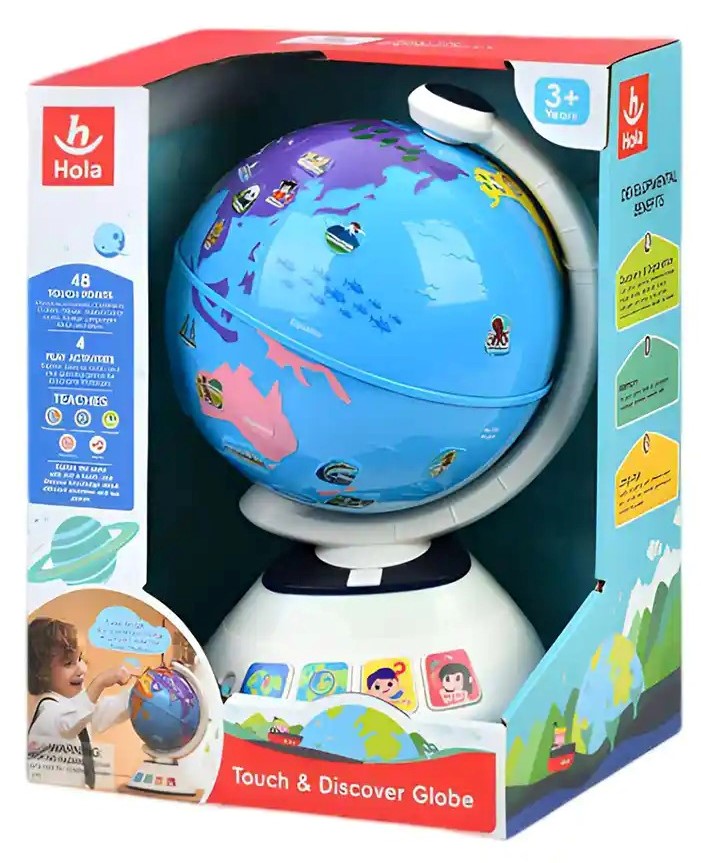 کره زمین موزیکال هولی تویز (Hola Toys Touch & Discover Globe HE8985)، یک اسباب بازی جدید آموزشی و سرگرمکننده، برای کودکان بالای سه سال است. با این کره زمین کاوش کن، به موسیقی گوش بده و به پرسش هایی که کره زمین از تو میپرسه جواب بده. این کره زمین لمسی است و اطلاعات جامع از طریق اسپیکر روی کره زمین بیرون می آید. اسباب بازی کره زمین موزیکال هولی تویز Huile Toys دارای پخش نور و قابلیت پخش موسیقی نیز می باشد.