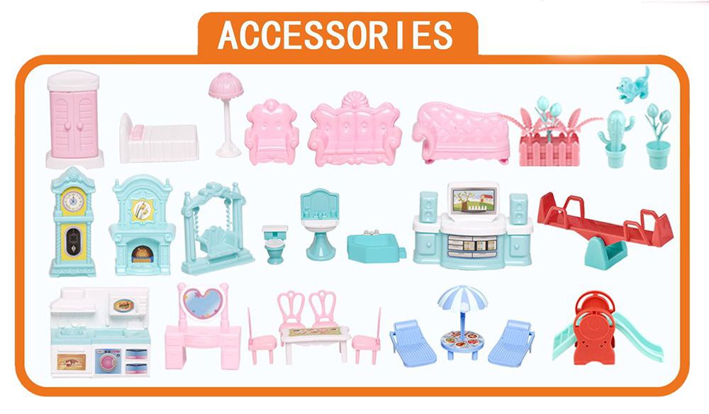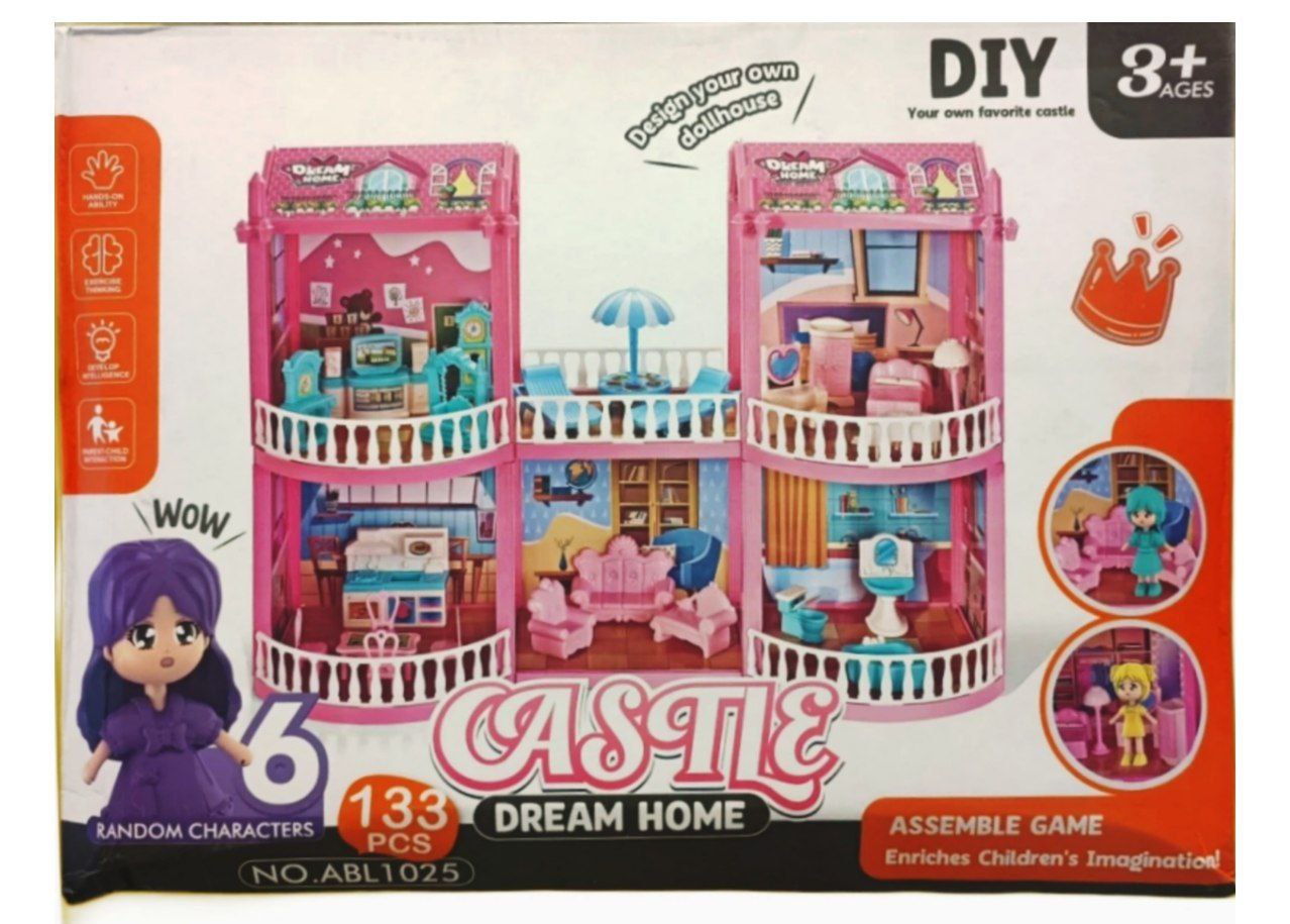 - ست کامل با ۱۳۳ قطعه متنوع: این مجموعه شامل بدنه خانه (دیوارها، طبقات و بخشها)، مبلمان، لوازم خانگی، تخت، میز، صندلی، وسایل آشپزخانه و خانه، و اقلام دکوراتیو است که امکان ساخت خانهای کامل برای عروسکها فراهم میکند.