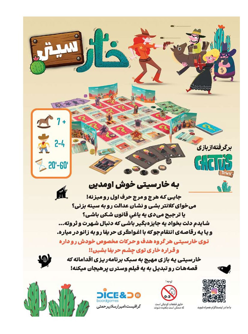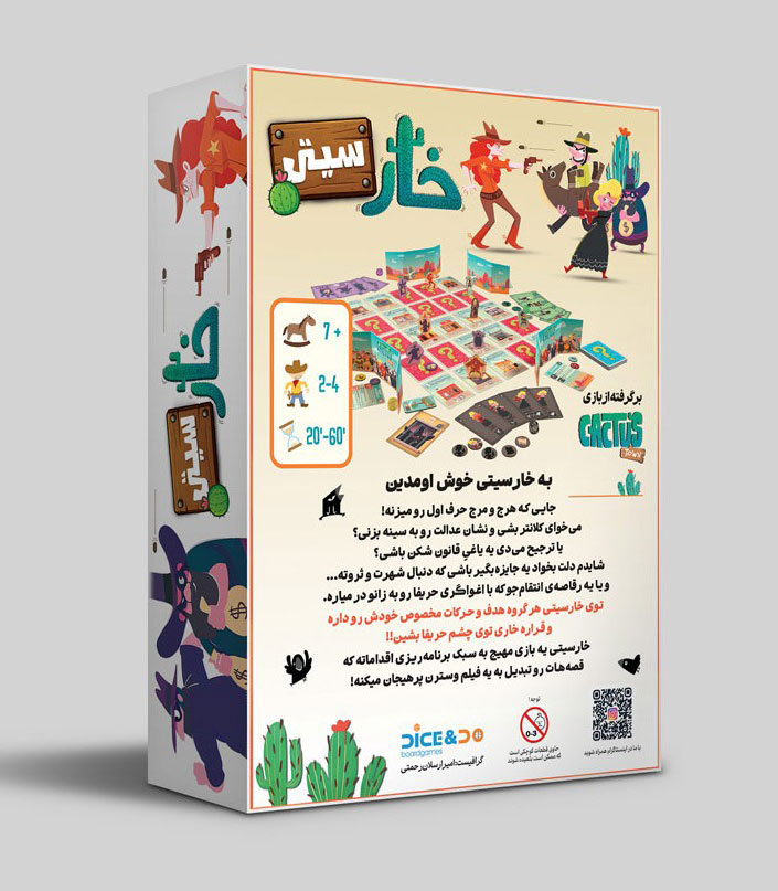 بازی ایرانی خارسیتی Cactus Town برگردانی از بازی خارجی Cactus Town است؛ یک بازی فکری خانوادگی، سبک و پرتعامل که شما را به دل هرجومرج غرب وحشی میبرد. در این بازی نامتقارن، هر بازیکن کنترل یکی از گروههای منحصربهفرد شهر خارسیتی را بر عهده میگیرد؛ از کلانتر قانونمدار گرفته تا یاغیهای قانونشکن، جایزهبگیرهای طماع و رقاصۀ انتقامجو.هر گروه اهداف، شرایط برد و سبک بازی مخصوص خود را دارد و همین موضوع باعث میشود هر دور بازی تجربهای متفاوت باشد. خارسیتی یک بازی برنامهریزی اقدامات است که تمرکز آن بر پیشبینی حرکات رقبا، تعامل مستقیم و تصمیمگیری هوشمندانه است. این بازی مناسب ۲ تا ۴ بازیکن، برای افراد بالای ۷ سال و با زمان بازی ۲۰ تا ۴۰ دقیقه طراحی شده و محصولی از گروه Dice & Do است.