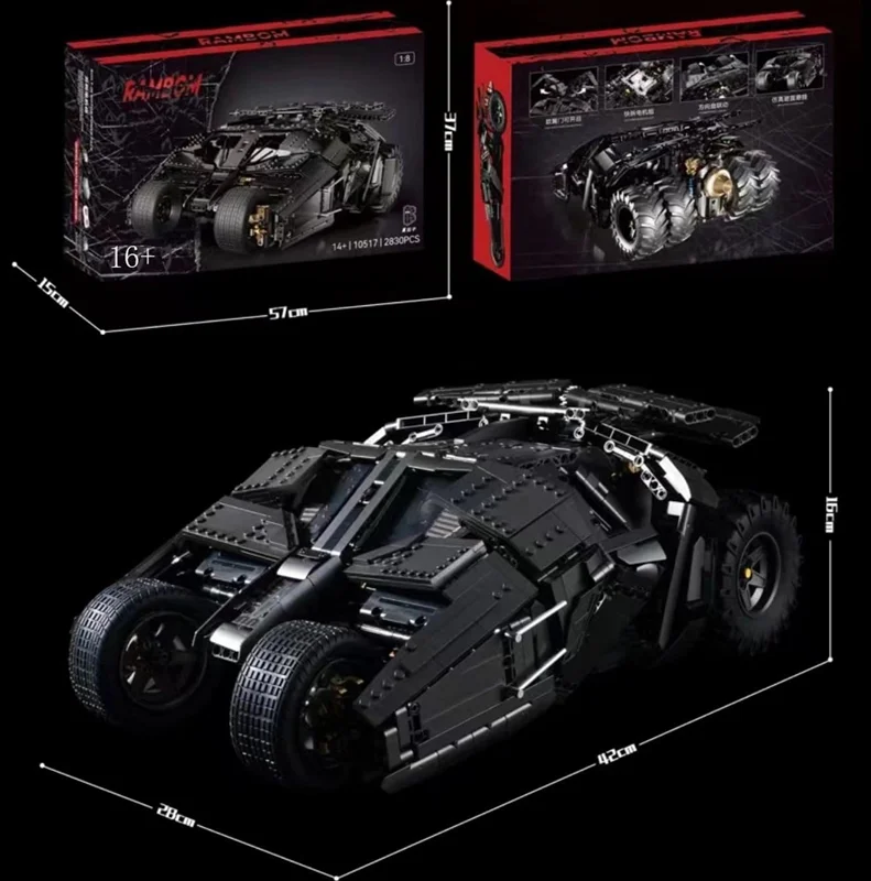 محصول لگو بتمن رمبوم مدل ۱۰۵۱۷ (Batmobile Rambom 10517)، شامل ۲,۸۳۰ قطعه دقیق و با کیفیت است که به مقیاس ۱:۸ ساخته شدهاند. بدنهٔ این Batmobile با طراحی آیرودینامیک، رنگ مشکی مات و عناصر خاکستری و نقرهای ترکیب شده است تا ظاهری قدرتمند، ترسناک و الهامگرفته از فیلمها و کمیکهای بتمن داشته باشد. جلوی مدل دارای خطوط شکسته، محافظتکنندهها، و تهویهها است؛ عقب آن با جزئیات موتور و خروجی اگزوز برجستهای طراحی شده است. چرخها رواناند، و کابین بازشونده امکان مشاهدهٔ داخلی را فراهم میکند.
