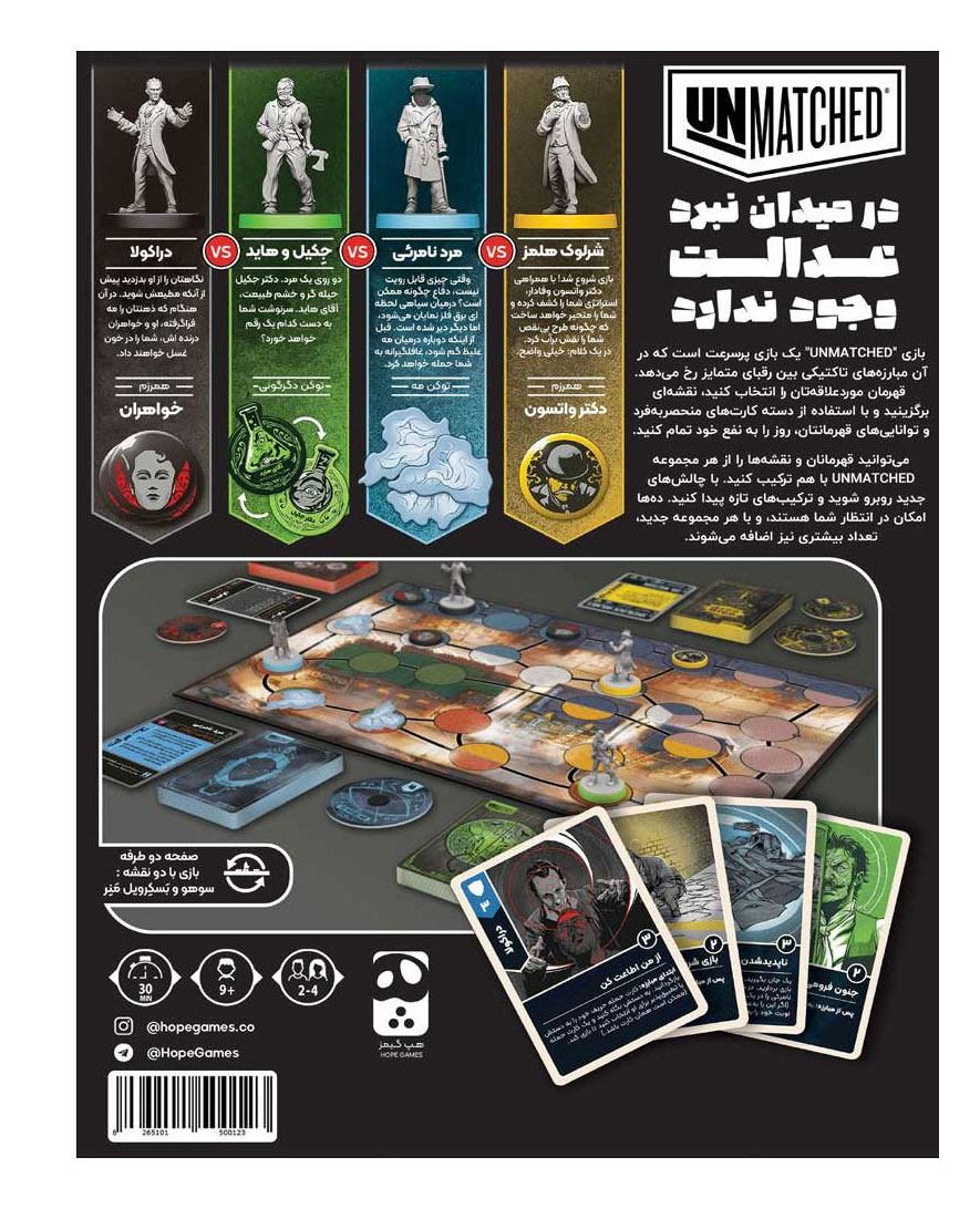 بازی بیهمتا: خیابانهای مهآلود Unmatched: Cobble & Fog یکی از برترین و تحسینشدهترین نسخههای سری آنمچد است که شما را به نبردی تاریک و نفسگیر در خیابانهای مهآلود لندن میبرد. این بازی فکری مبارزهای، برگردانی از نسخه خارجی Unmatched: Cobble & Fog بوده و شامل ۴ شخصیت افسانهای با قدرتها و سبک مبارزه کاملاً متفاوت است: شرلوک هلمز، دراکولا، دکتر جکیل و مرد نامرئی.هر شخصیت دارای دسته کارت اختصاصی، توانایی ویژه و استراتژی منحصربهفرد است که باعث میشود هیچ نبردی شبیه قبلی نباشد. این نسخه که از نظر رتبه و امتیاز جهانی یکی از بهترین نسخههای Unmatched محسوب میشود، قابلیت ادغام با نسخه اول را نیز دارد و توسط گروه هپ گیمز تولید شده است.
